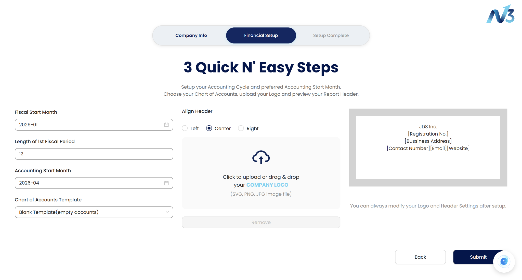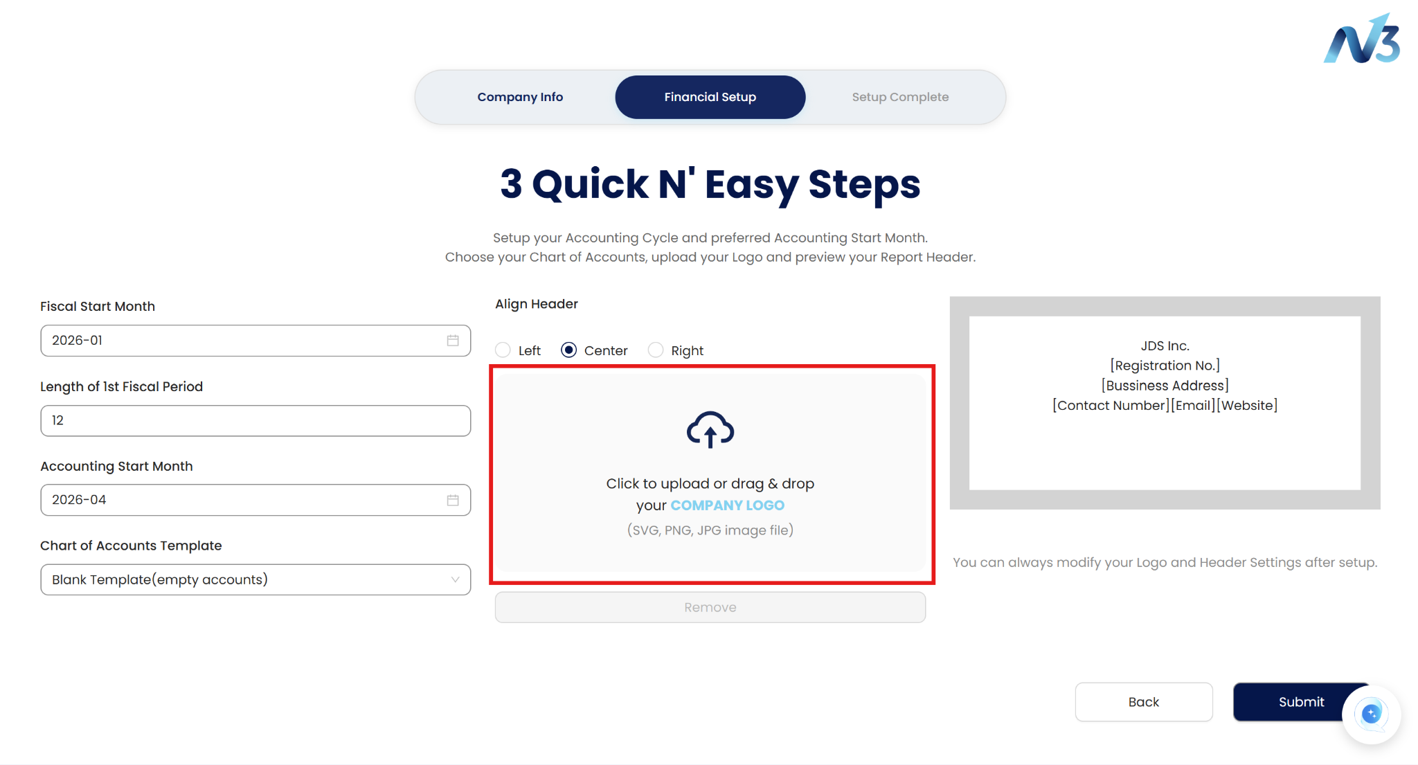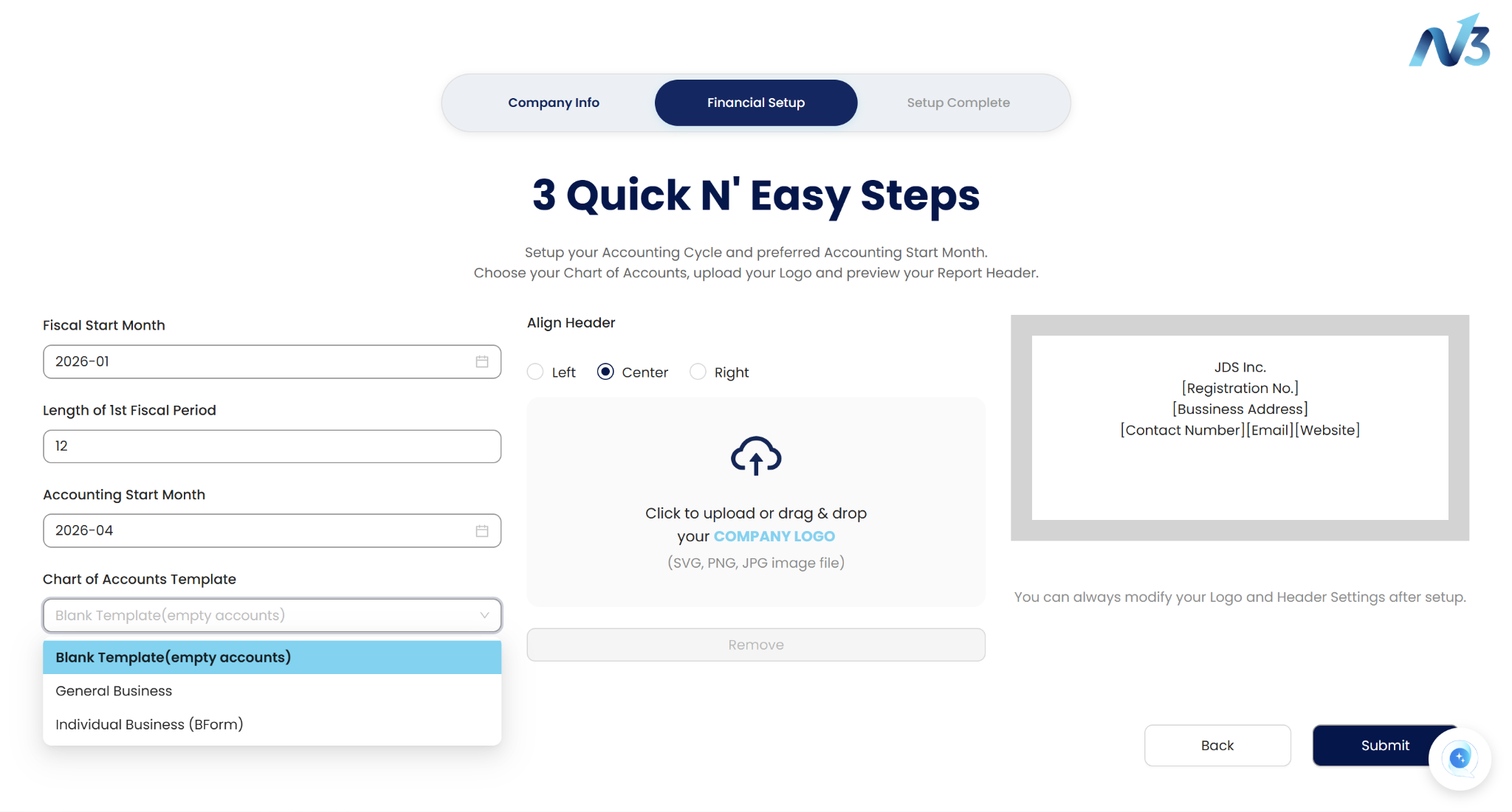 STEP 2: Define Financial Period and Cut Off Date, Chart of Account Template, Upload Company Logo and adjust your Document Header.