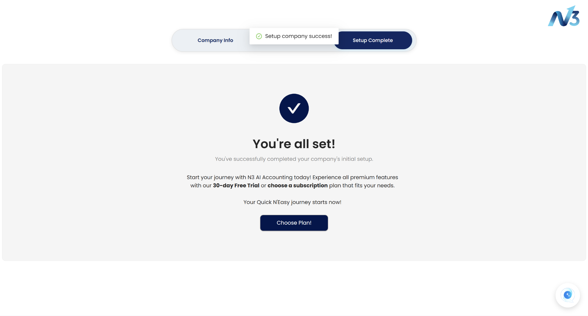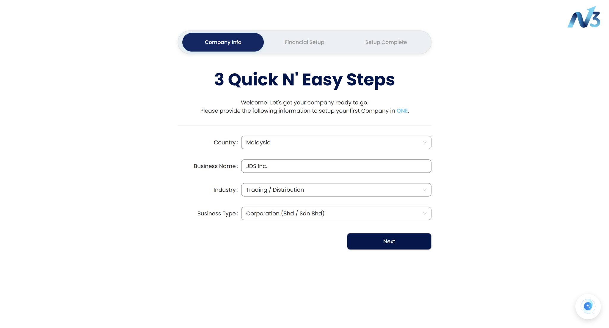 After completing the registration process and agreeing to Terms of Service and Privacy Policies, you will be taken to 3 Quick N’ Easy Steps On-boarding Process. You may now starts to set up your very first Company in QNE Cloud Accounting.
