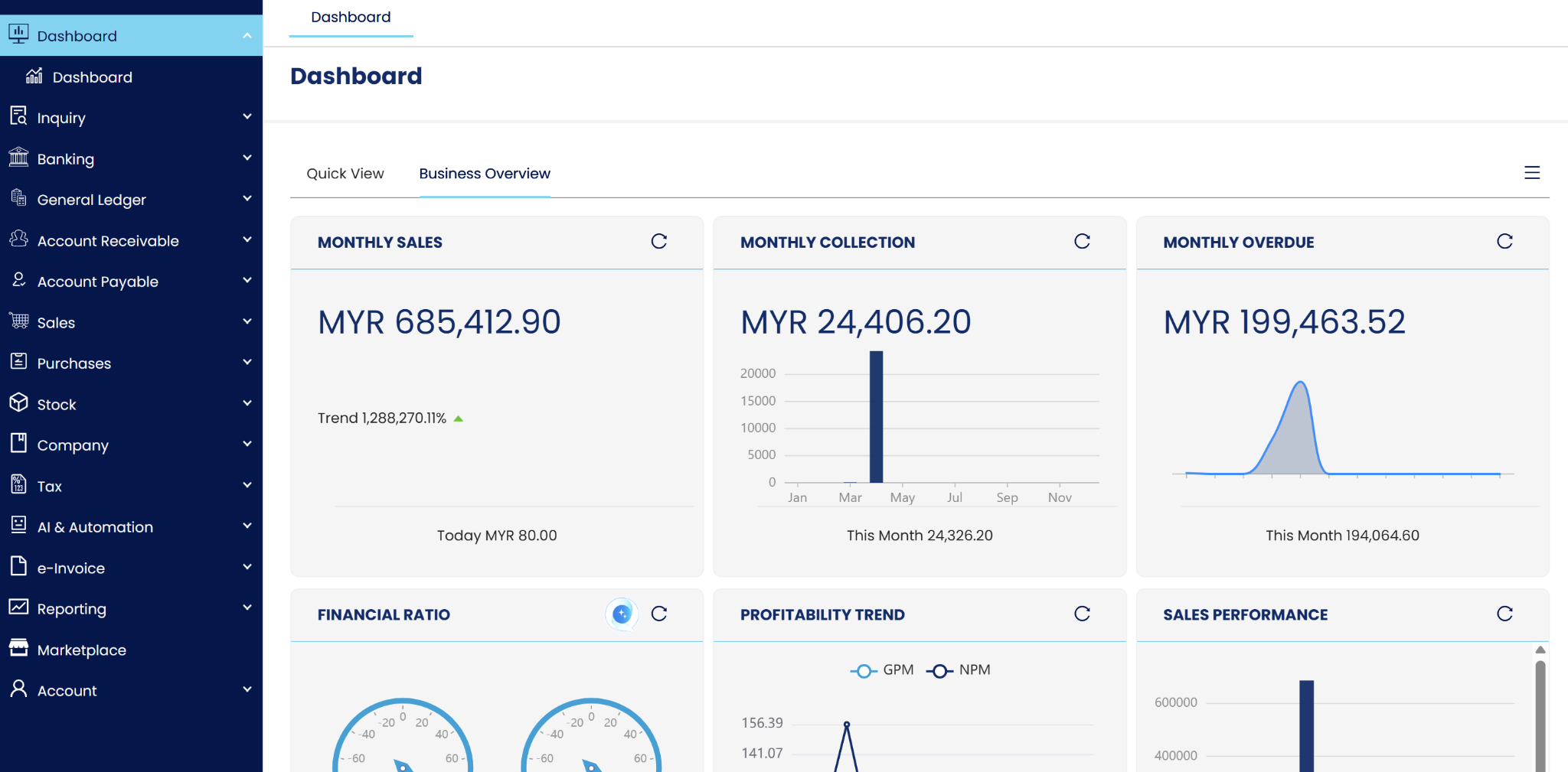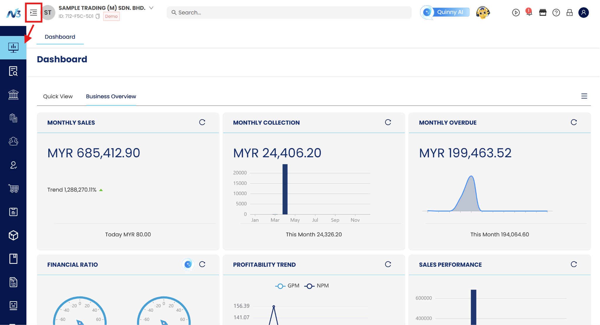 Access Dashboard and other screens via the Navigation Pane and start your journey with QNE Cloud Accounting System.