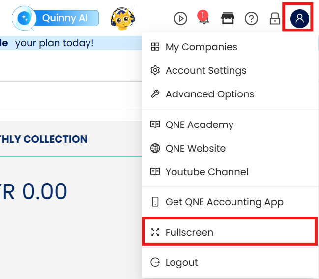 In N3 AI Accounting (formerly QNE AI Cloud Accounting), we offer a full screen display mode where in this display mode will cover the entire screen excludes out browser UI elements and Operating system menus, providing a more immersive and focused experience for user. The following solution steps will show you how to enable full screen display in N3 AI Accounting.