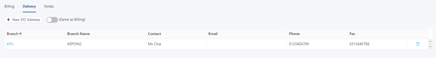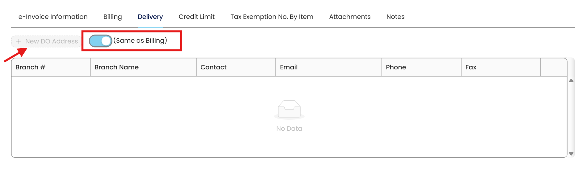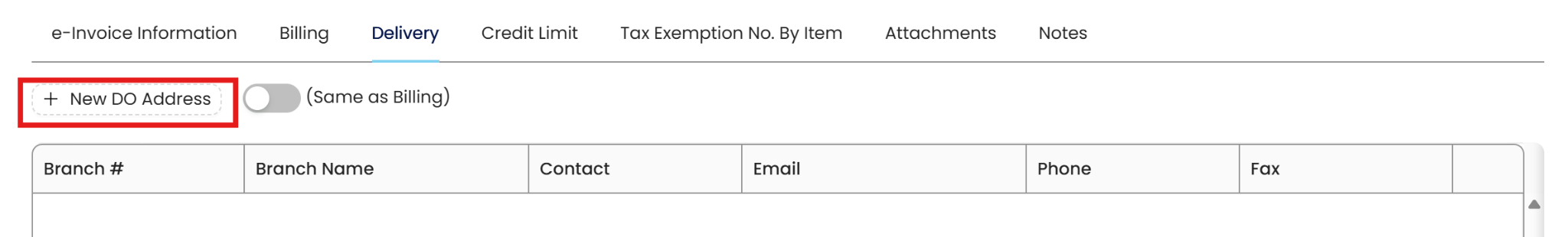 Click on Delivery to switch to this screen. Toggle Off (Same as Billing) button to enable the +New DO Address button.