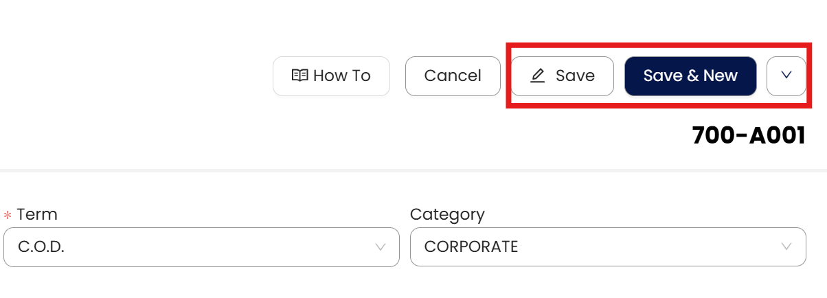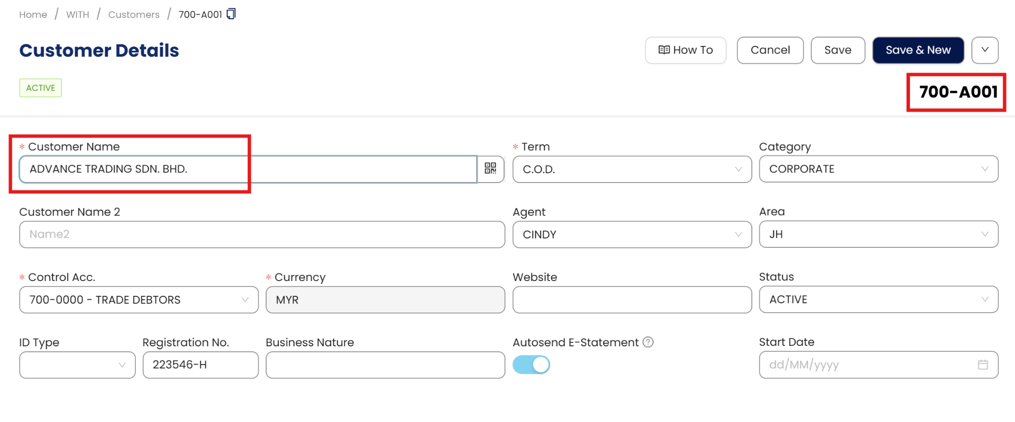 Input the Customer Name. Notice that the Customer Code is generated automatically.