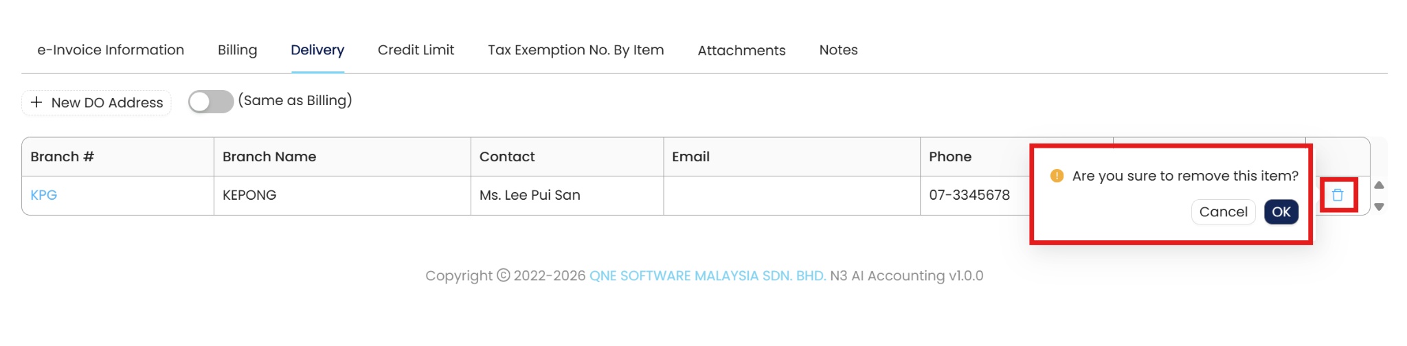 You may also Delete a delivery address if it’s no longer in use. Under Delivery tab, click on the Delete icon at the far-right end. Click on OK at the Confirmation Message to delete the delivery address.