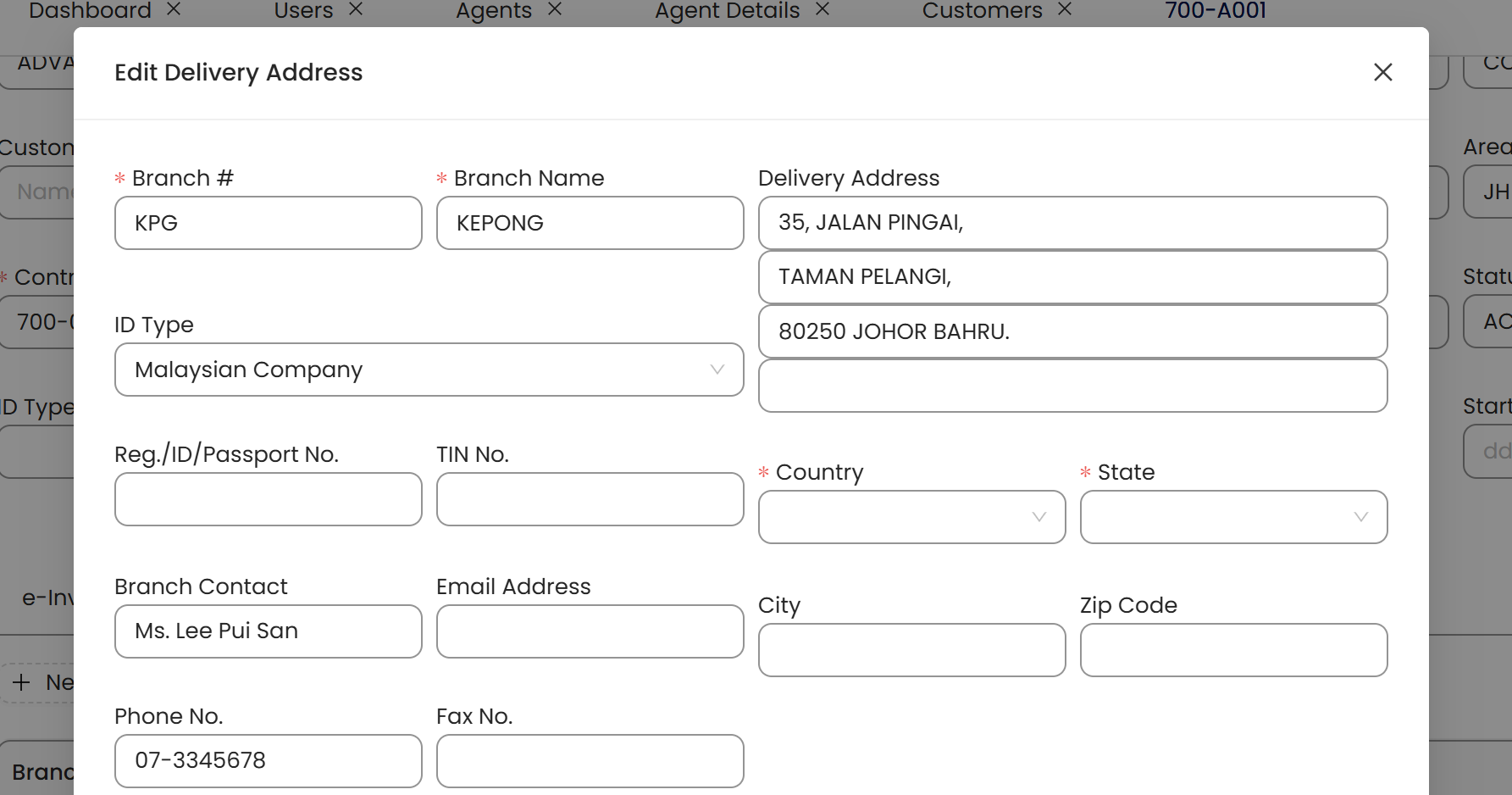 If the customer has multiple delivery locations, you may also add in other delivery addresses under Delivery Tab.