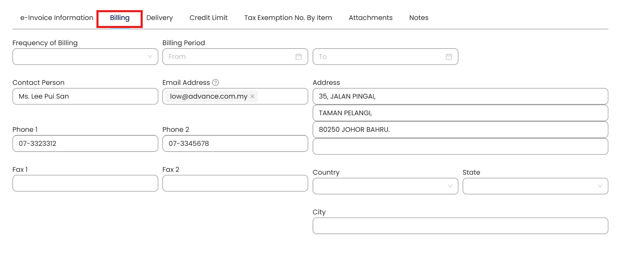 At the section below, under Billing Tab, fill in the customer Billing information. The information in Billing by default are also the customer’s Delivery address, if not defined otherwise in the transaction forms.