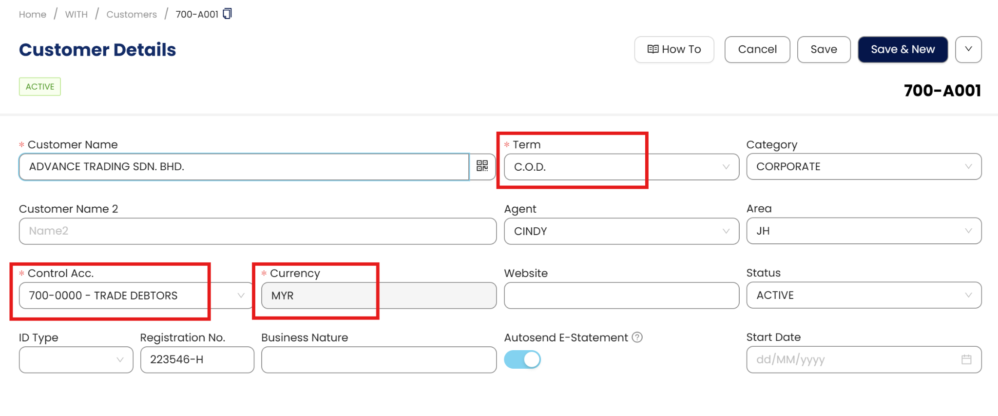 Define the compulsory fields – Control Account, Currency and Term, if the fields are selected by default, you may change to other options accordingly.