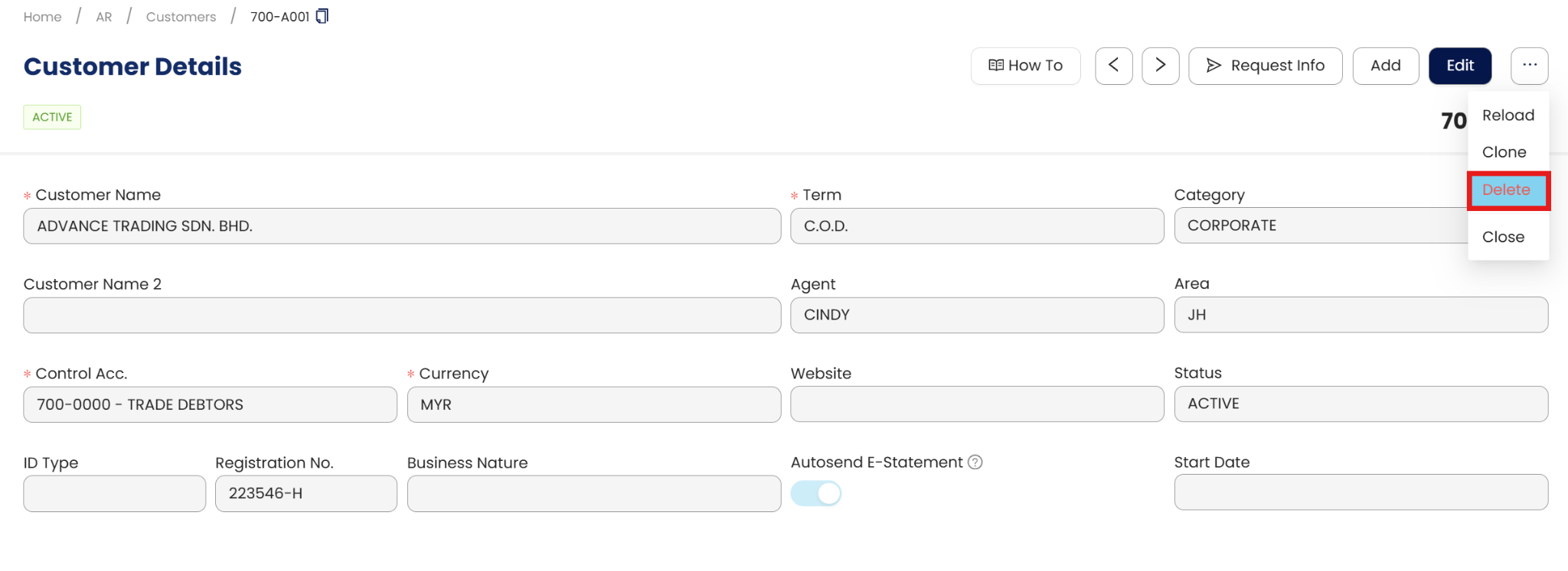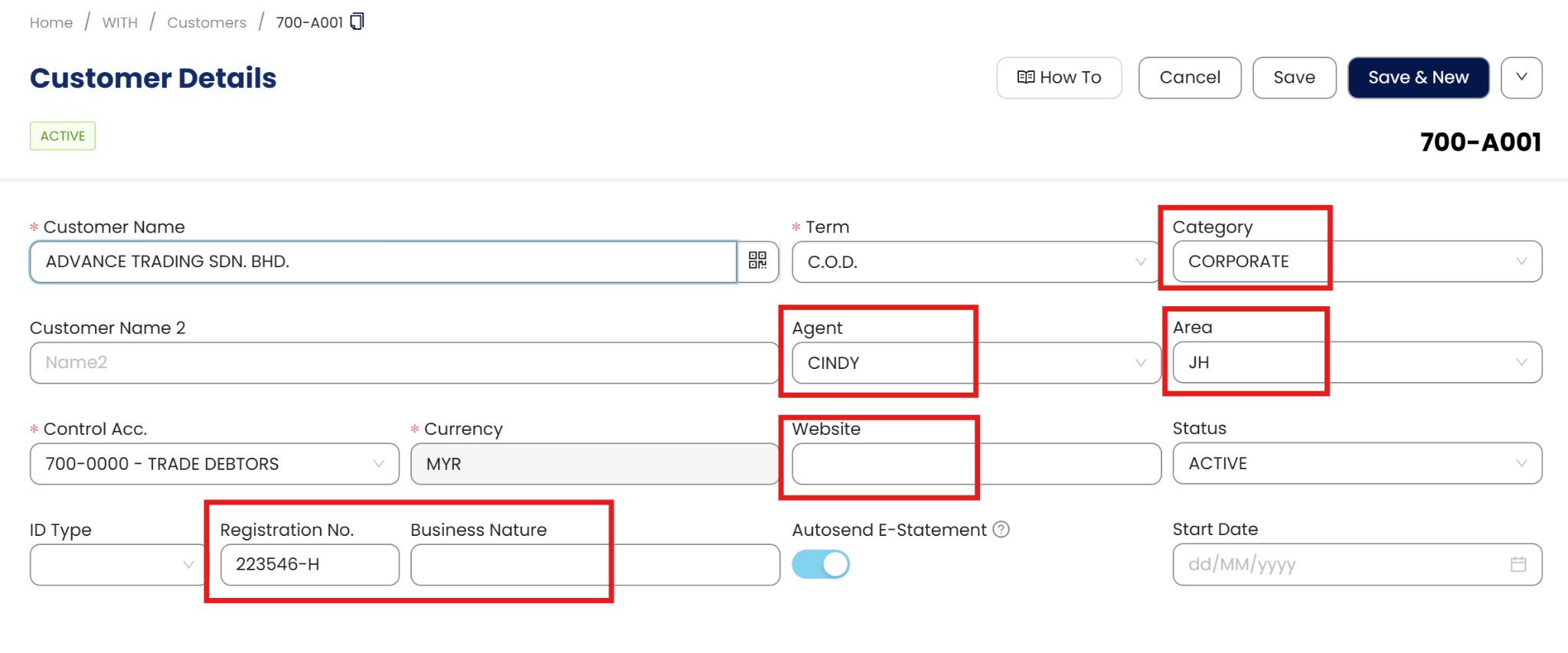 You may also define the customer’s Category, Agent in charge and Area. Various reports can be generated using these fields as the filtering criteria, which might just provide important information such as business performance according to customer category or customer area.