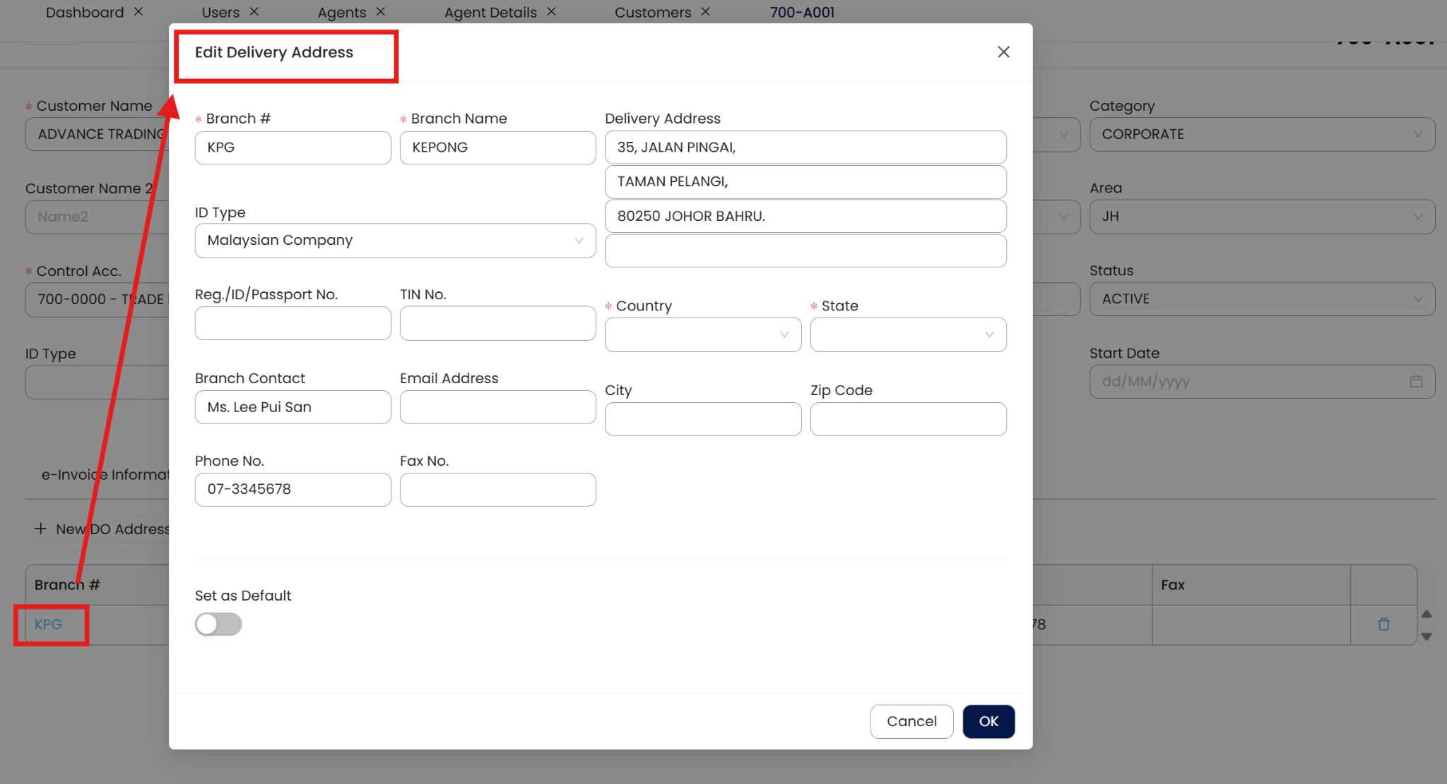 Input Branch# and Branch Name. Fill in the Delivery Address and other information. You may toggle Set as Default button to set this address as the default delivery address for transactions under this customer.