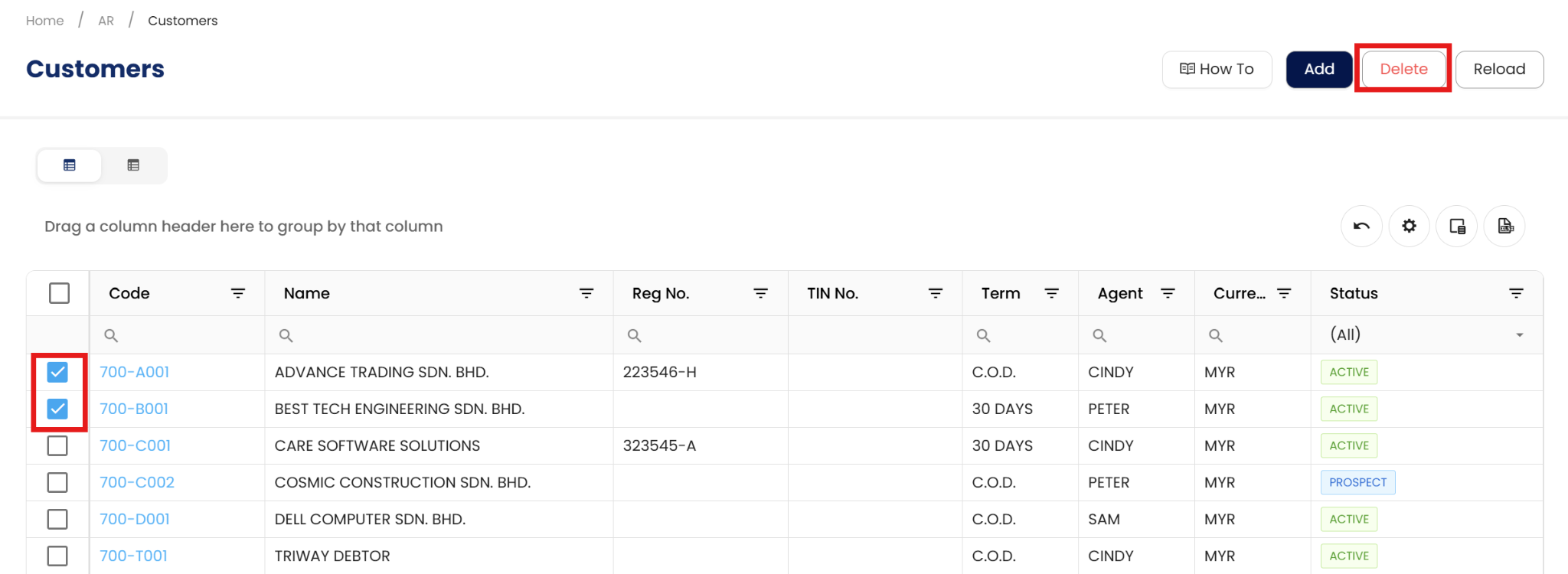 You may easily pick several items by using the checkboxes in the far-left corner of each transaction. The Delete button will be enabled after you have chosen the customer(s) you want to delete.