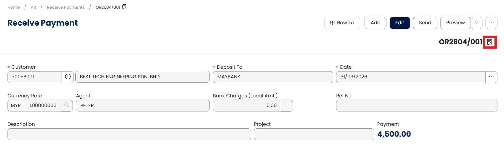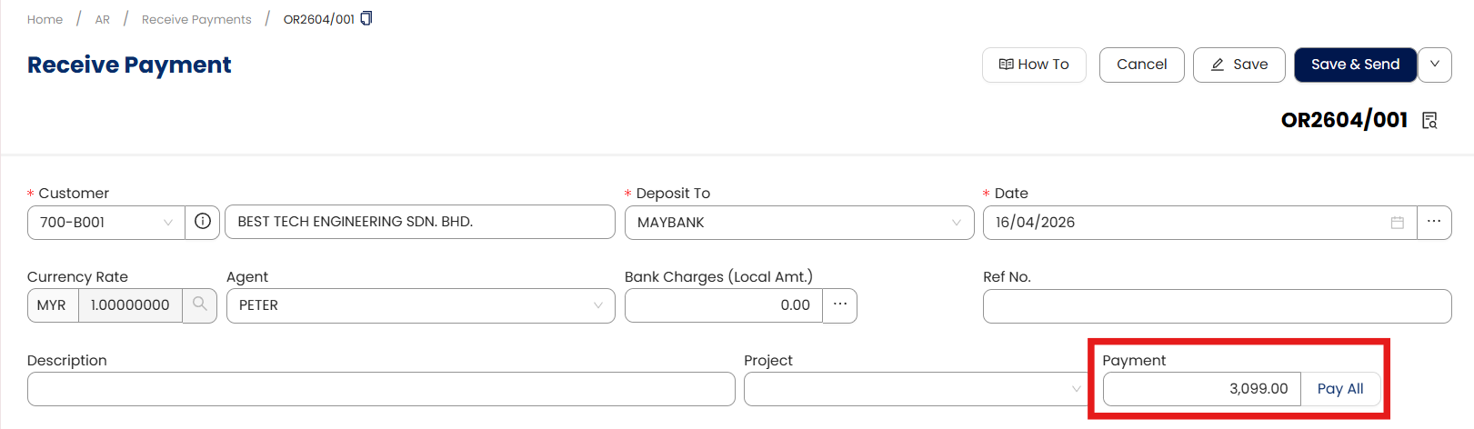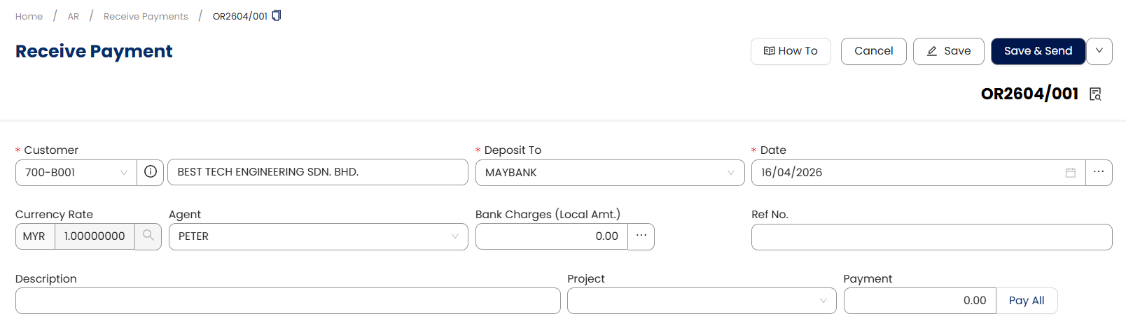 In the Receive Payment form, select first your ‘Customer Account’. ‘Deposit To’ will follow whichever Default Account is set. Modify according to which actual Cash or Bank Account the payment will debit to. Input the Doc Date, and overwrite the defaulted Agent if needed.