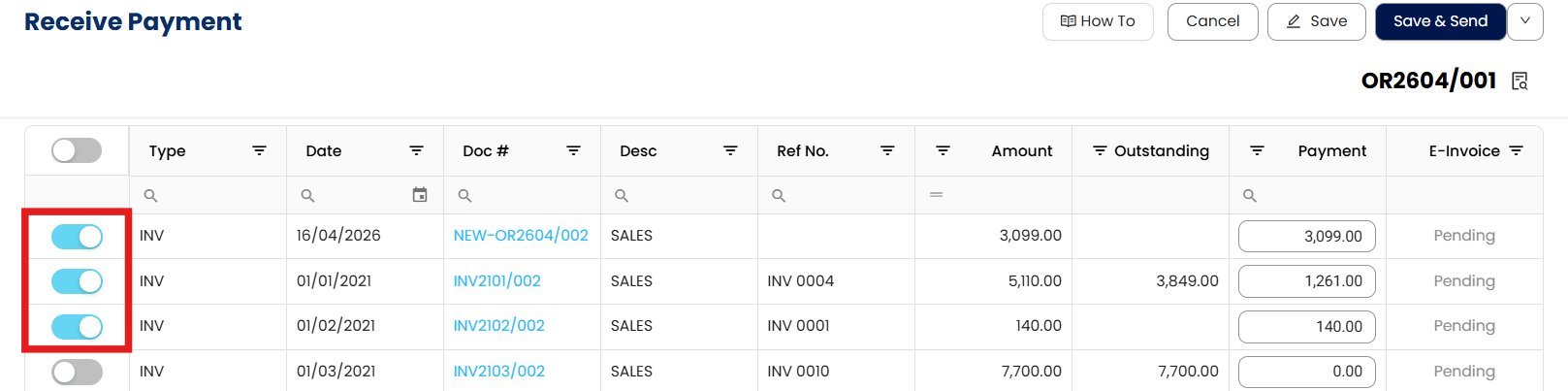 If the collection is for Multiple Invoices, toggle on or click match, for each Invoice/Debit Note to knock-off and input the amount of collection accordingly.