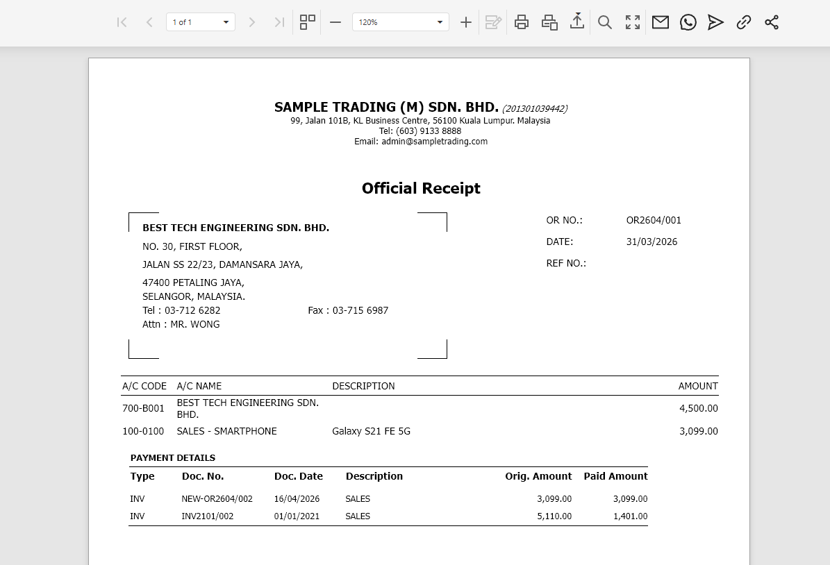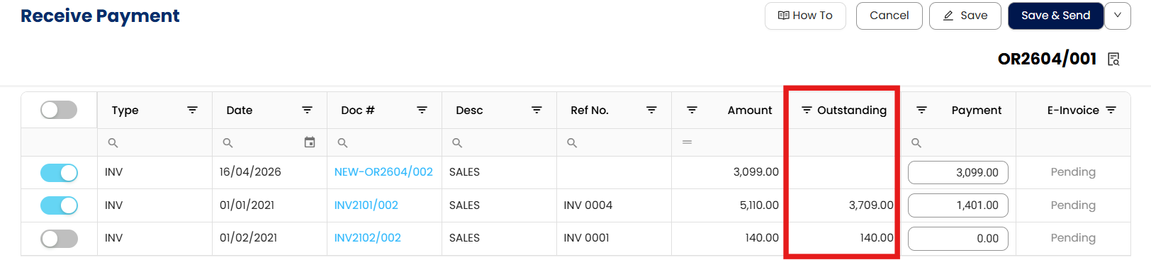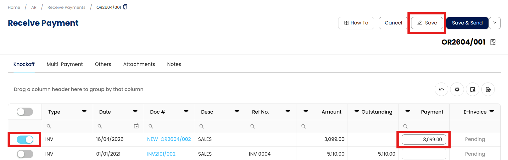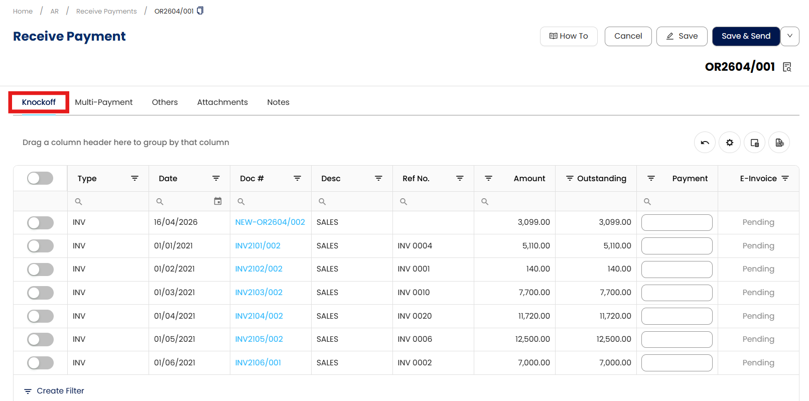 On the lower part, which is the Knock-off tab, is where all Outstanding Invoice or Debit Notes for the selected Customer Account are listed.