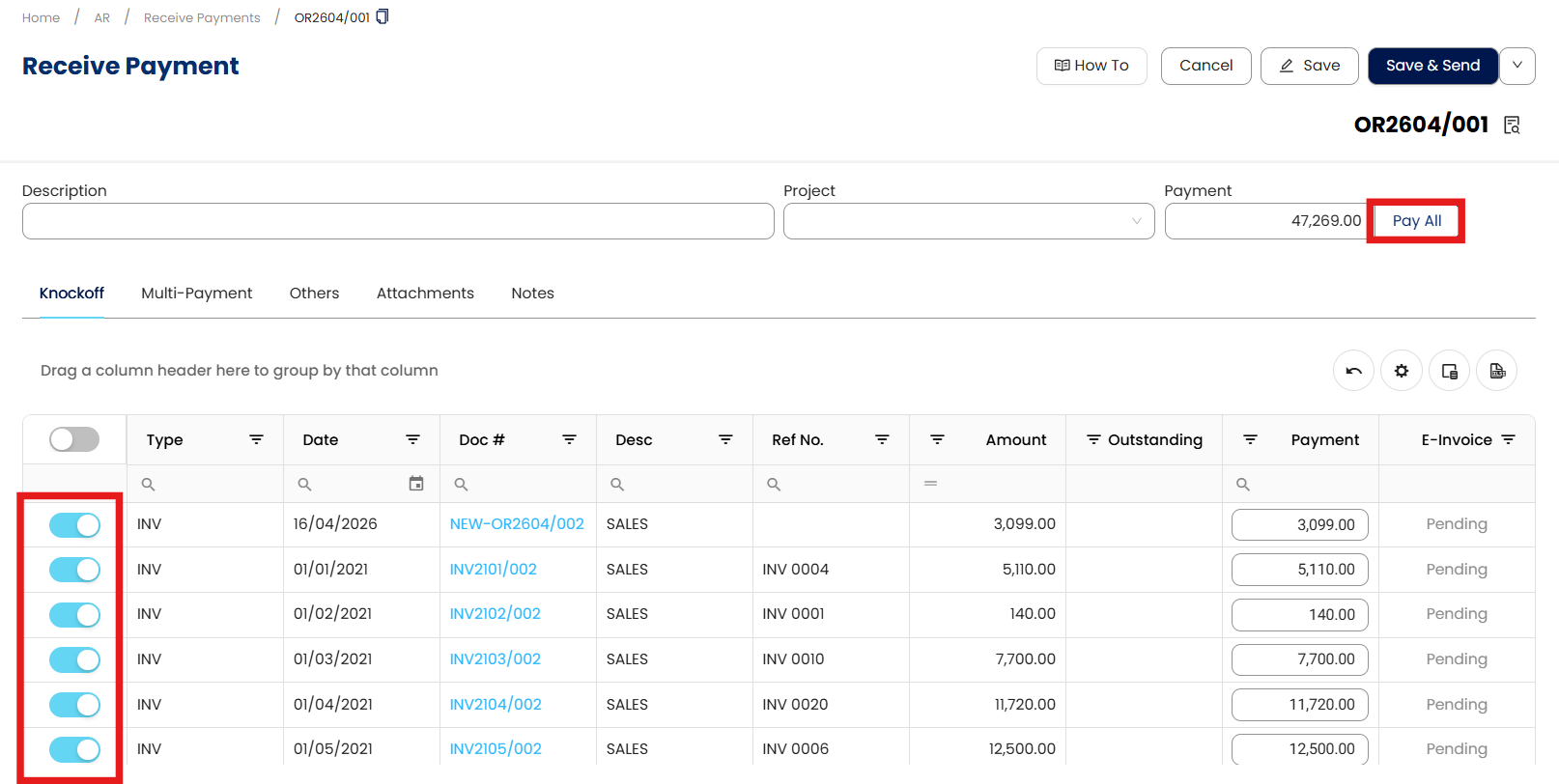 As a helpful function, ‘Pay All’ option is available which allows users to toggle on or match every single outstanding Invoice in case collection will be matched to all.
