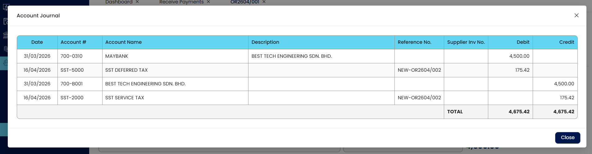 Changing the Payment Amount to 4,000.00, For partial payment, it can be visibly seen that the remaining unpaid amount is reflected in the ‘O/T’ (Outstanding) Column.