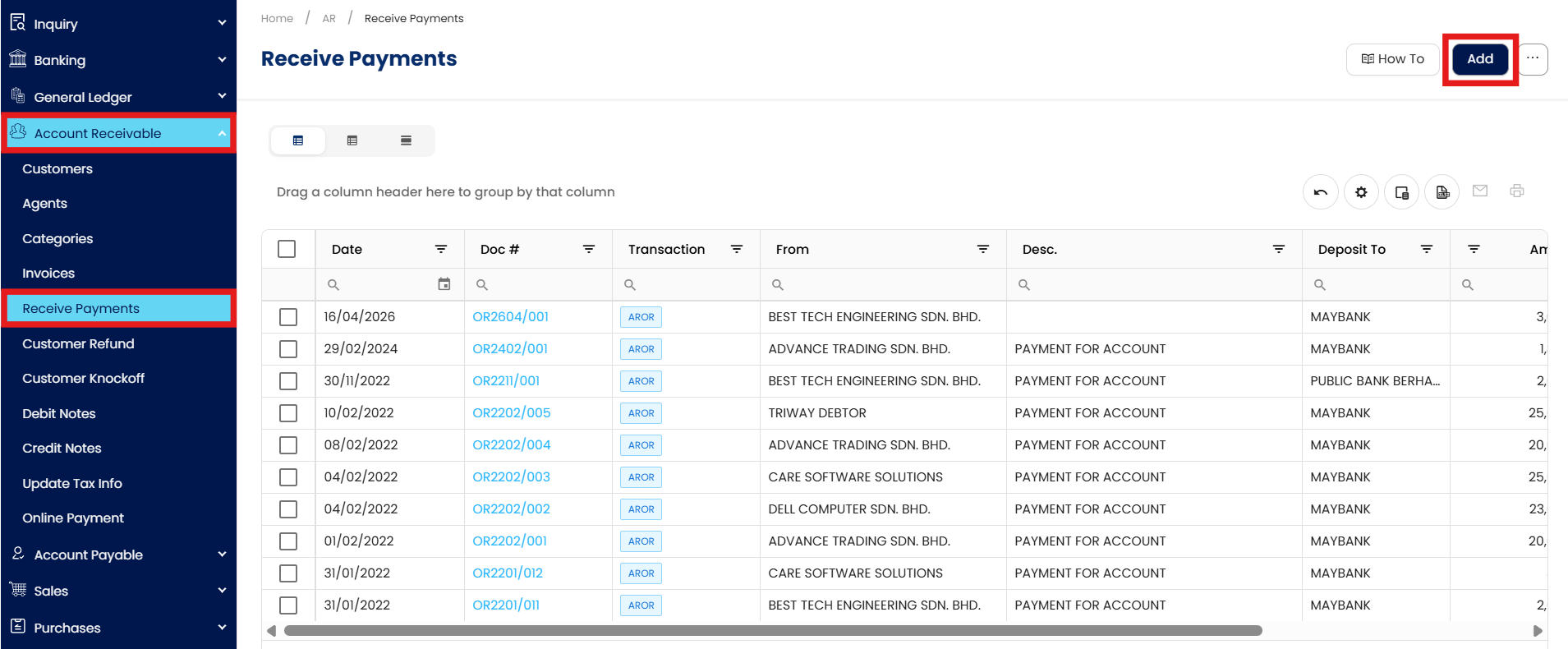 From the Navigation Pane, click Account Receivable, then choose Receive Payments. Next, click the ‘Add’ button to record a new collection.