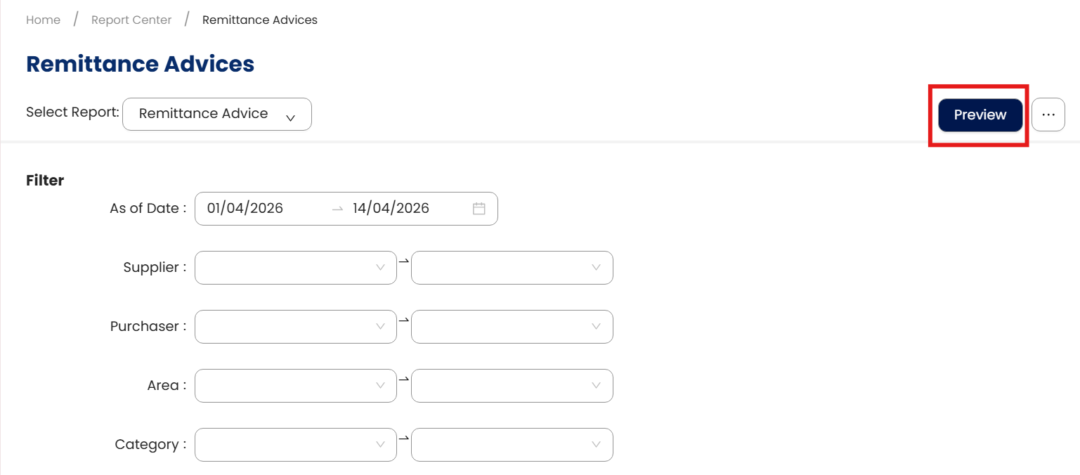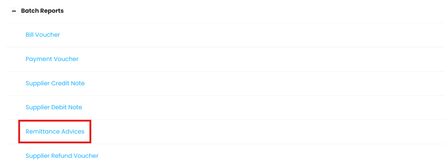 To Preview Remittance Advices, go back to Supplier Reports Menu, expand Batch Reports. Select Remittance Advices.