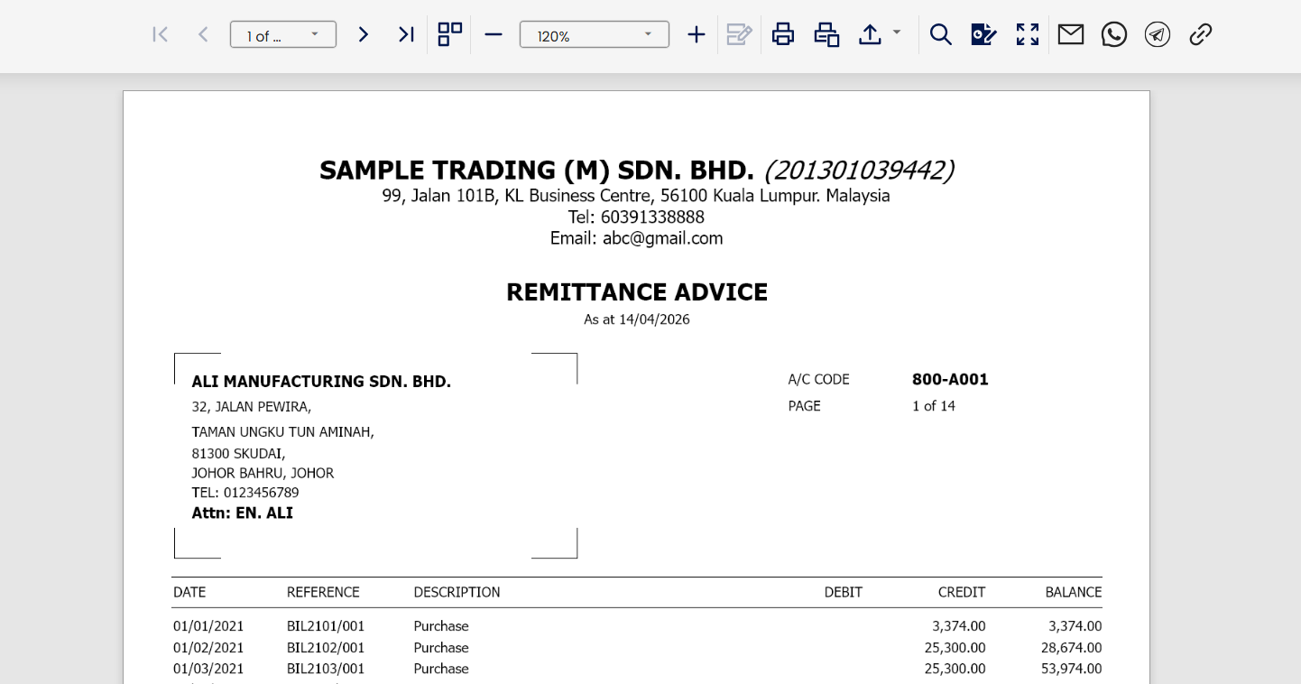 Other than the Journal, Receipt, and Payment Vouchers batch report, we can also generate Remittance Advice Report under Supplier Report.