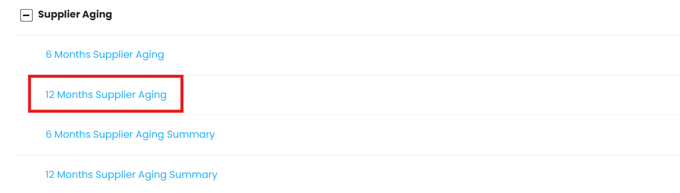 Let’s try to Preview the 12 Months Supplier Aging Report. Go back to the Supplier Reports Menu, expand Supplier Aging, and click on the 12 Months Supplier Aging to generate.