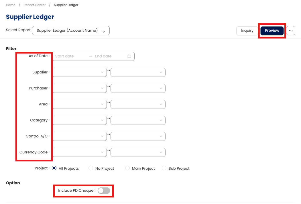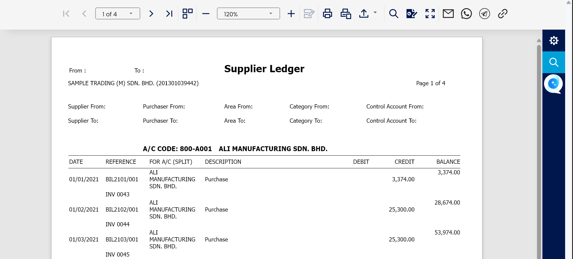 Once filtered, click “Preview” and another Tab will open to show the generated Supplier Ledger report.