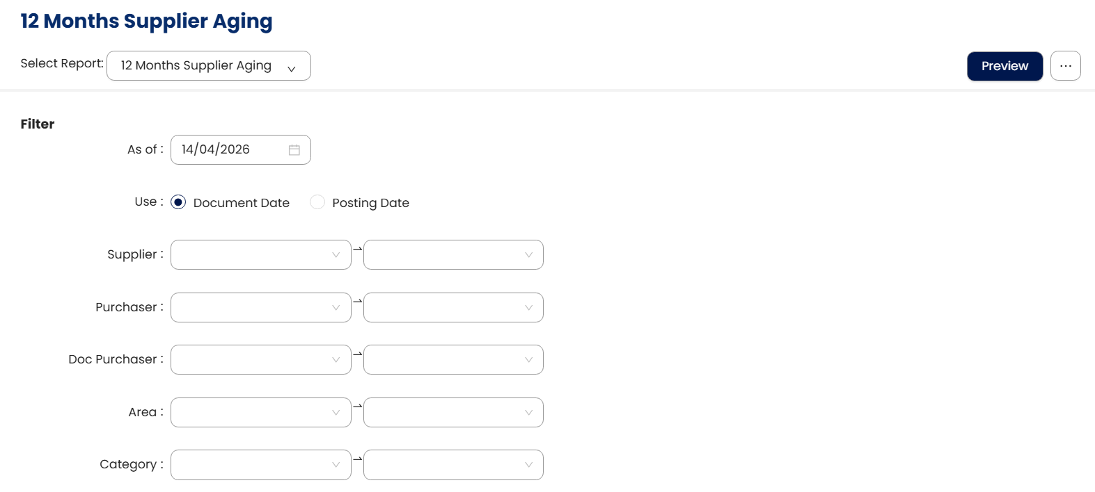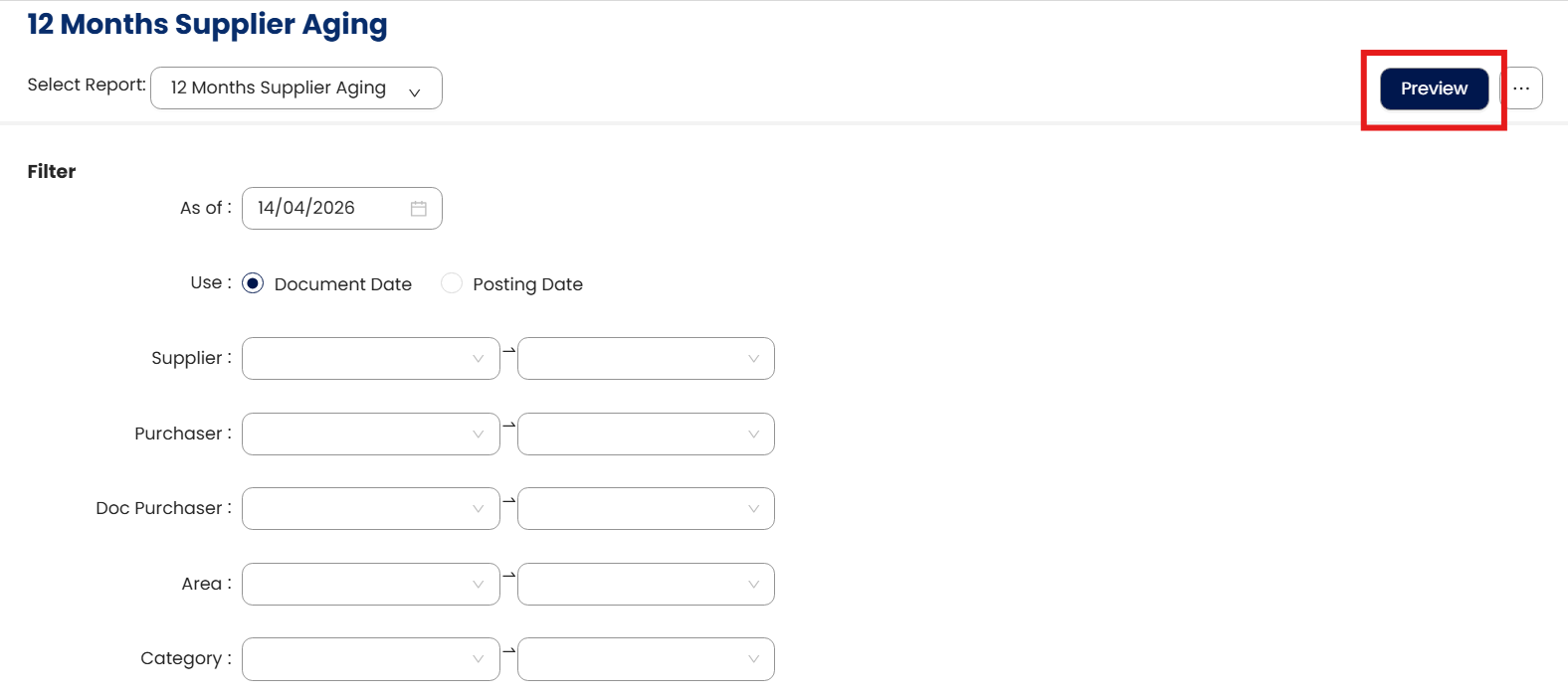Once filtered, click “Preview” and a new browser Tab will open to show the generated 12 Months Supplier Aging report.