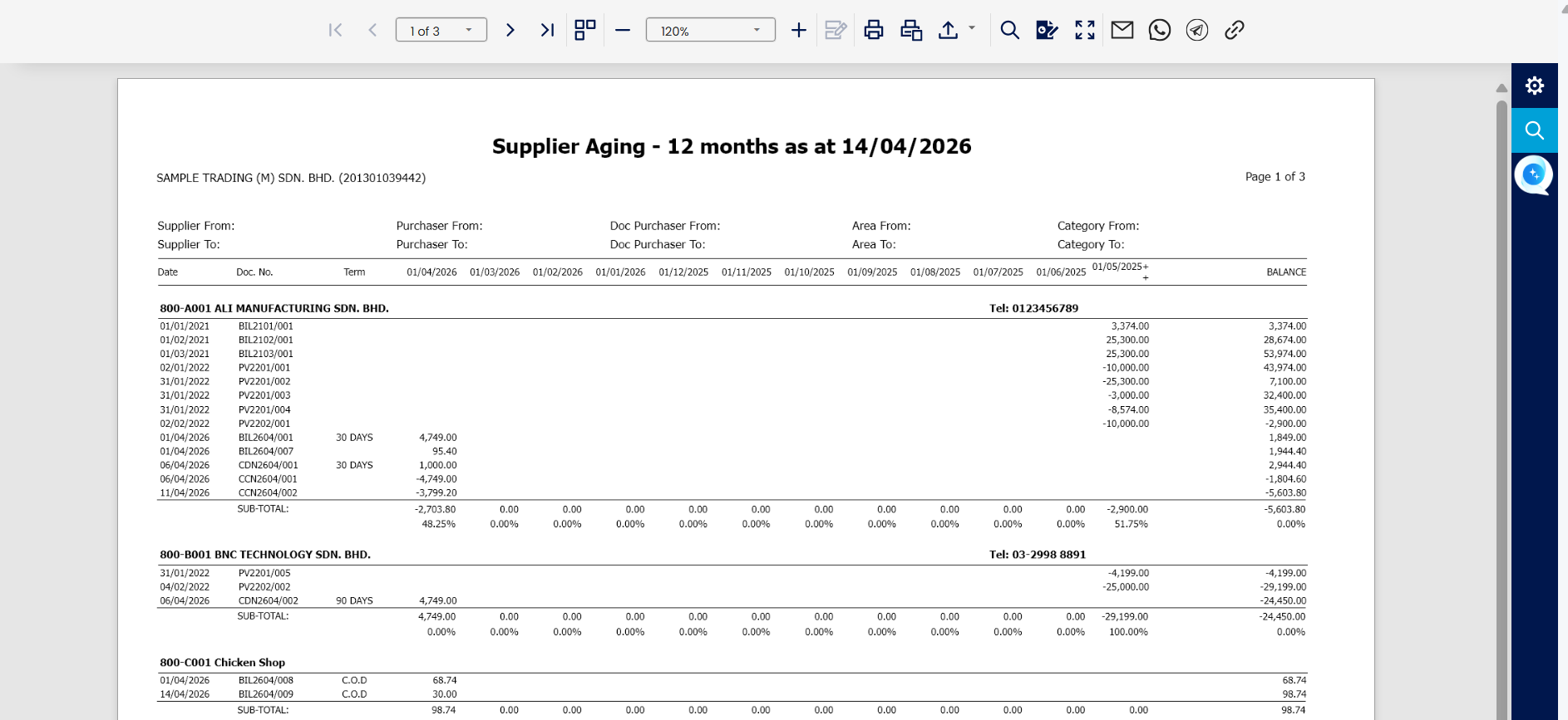 Monitor all your unpaid bills especially bills that are due by generating a 12 Months Supplier Aging Report. This report calculates aged days based on the terms you agreed upon with your supplier and selected under the Supplier’s Maintenance and Transaction forms.