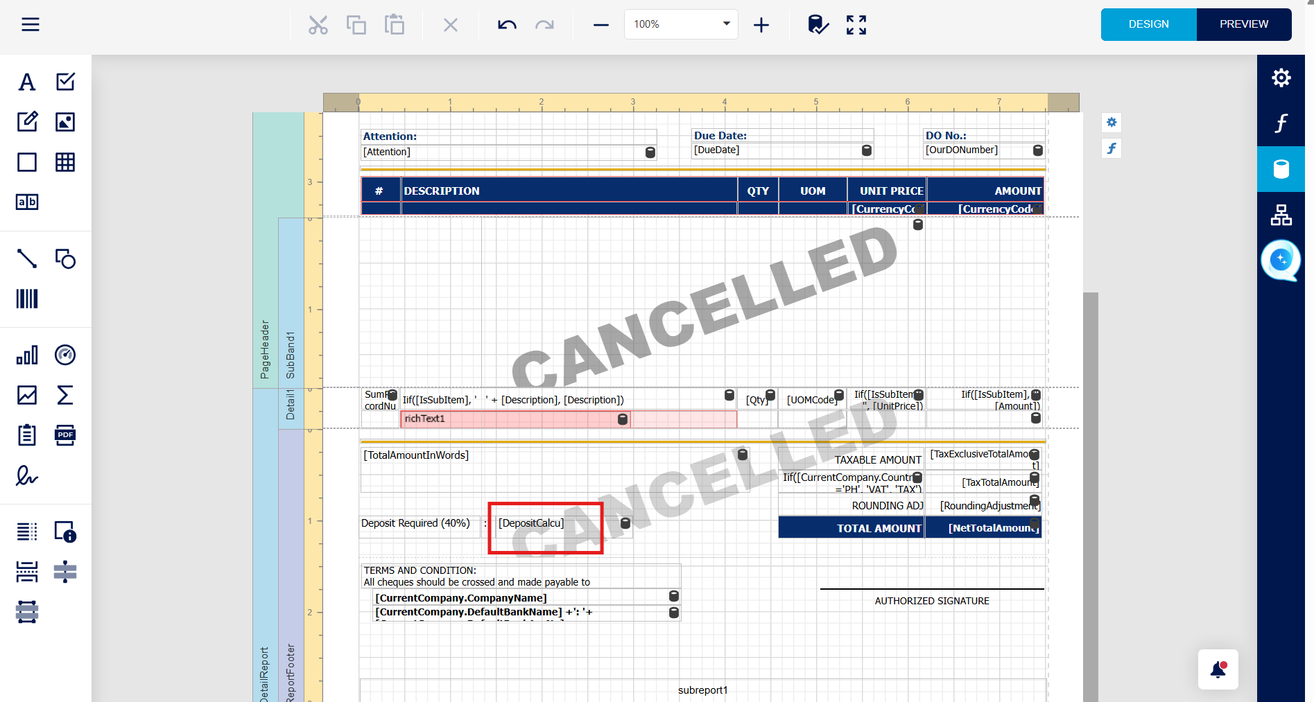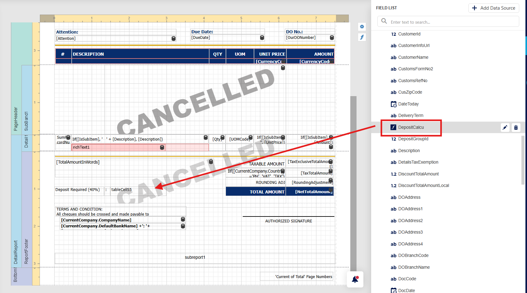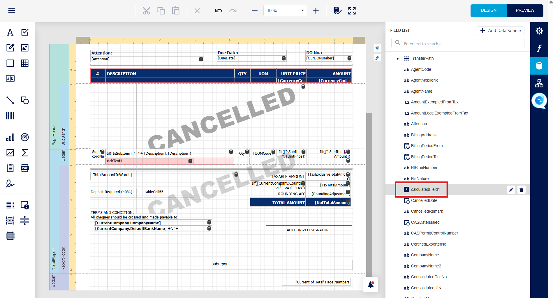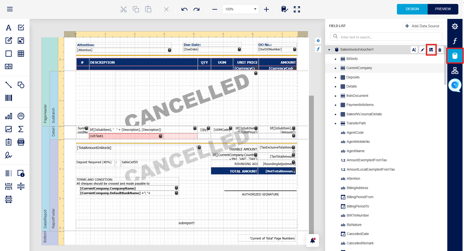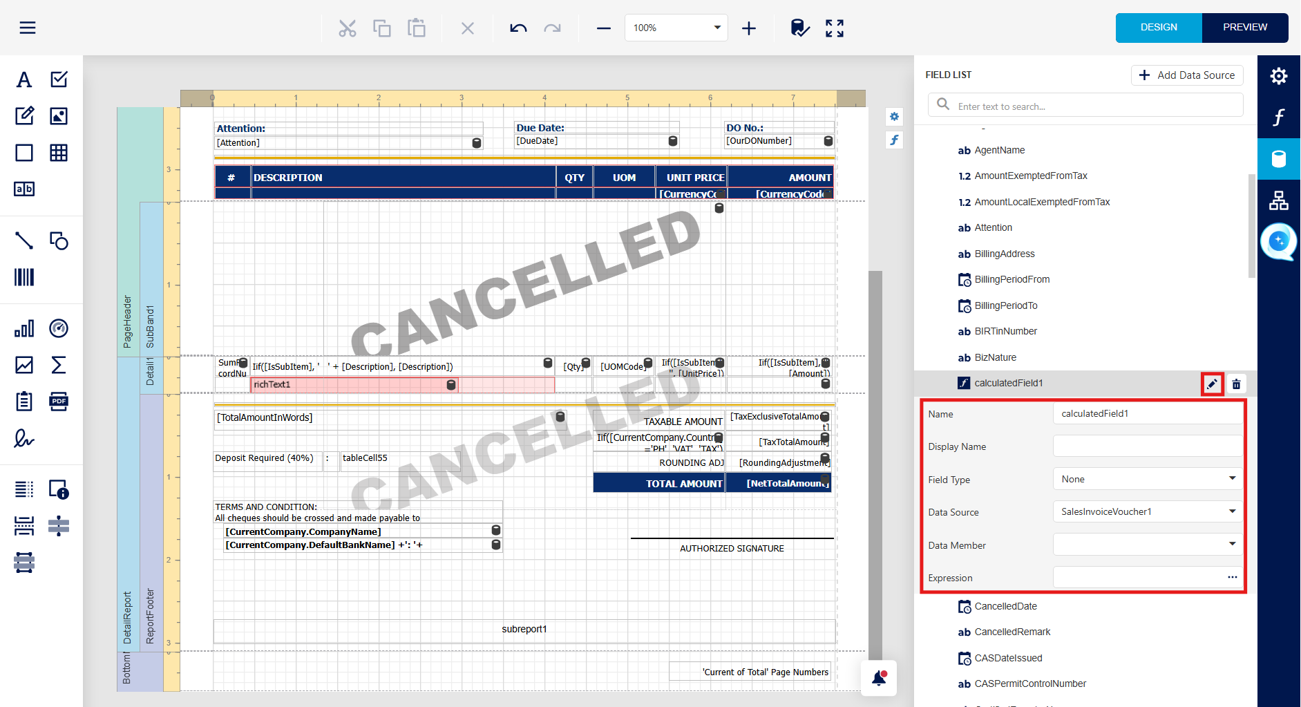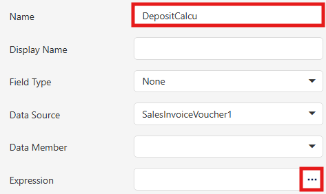 Step 1 - in report Designer > Press Field > at "SalesInvoiceVoucher1" > Press Add Calculated Field.