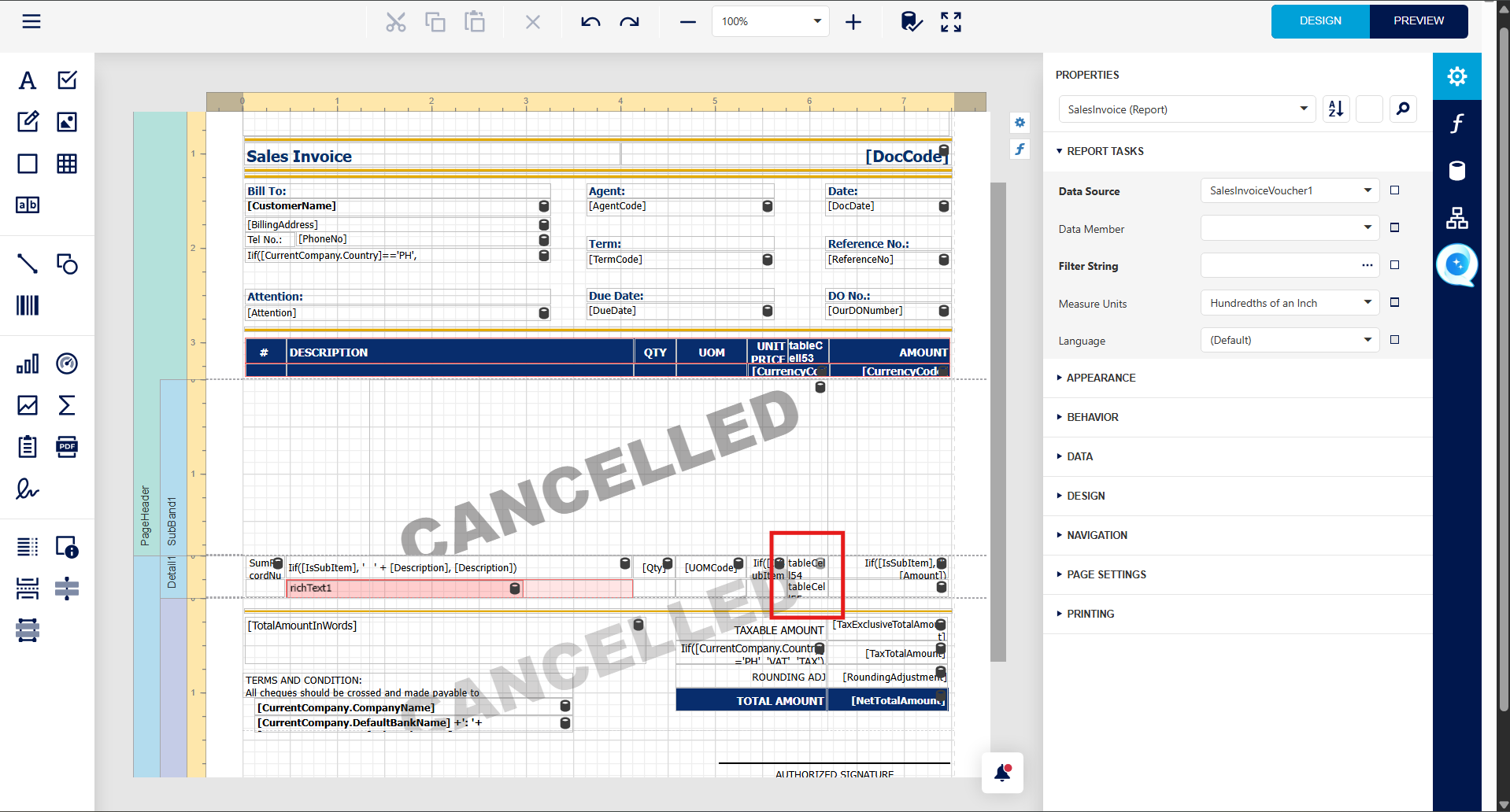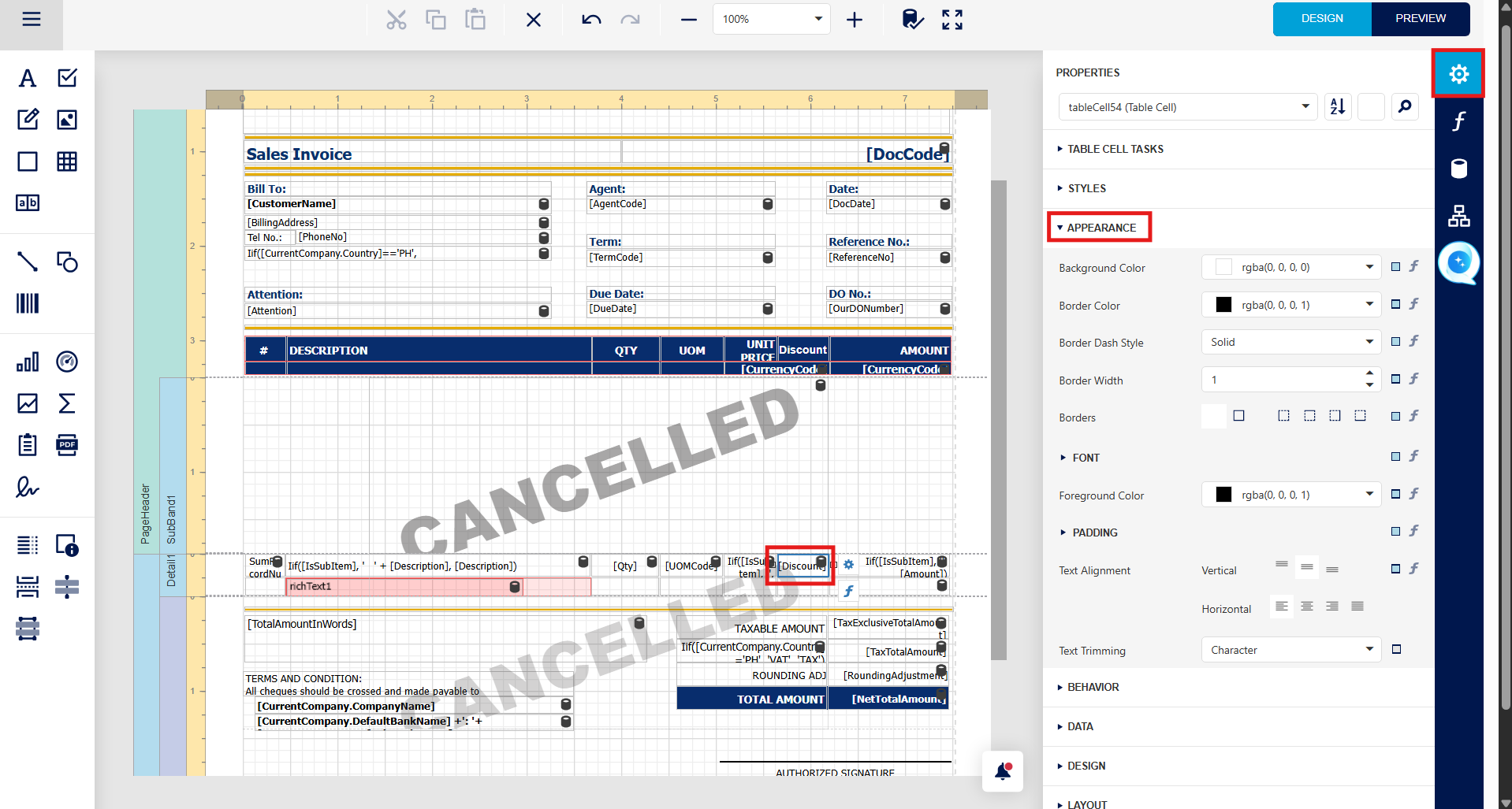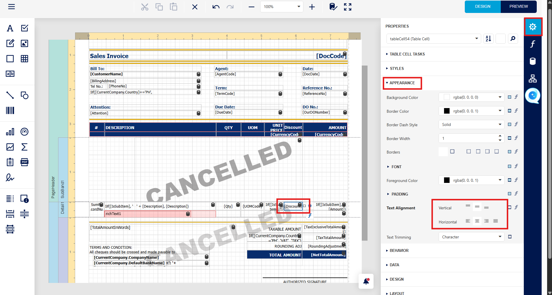 Step 8 - Press the Field which Drag the Discount > then Press Properties > Expand Appearance > Text alignment all to Middle