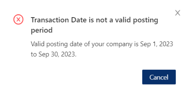 Block – Unable to proceed with the saving of the transaction if it's outside the valid posting date.