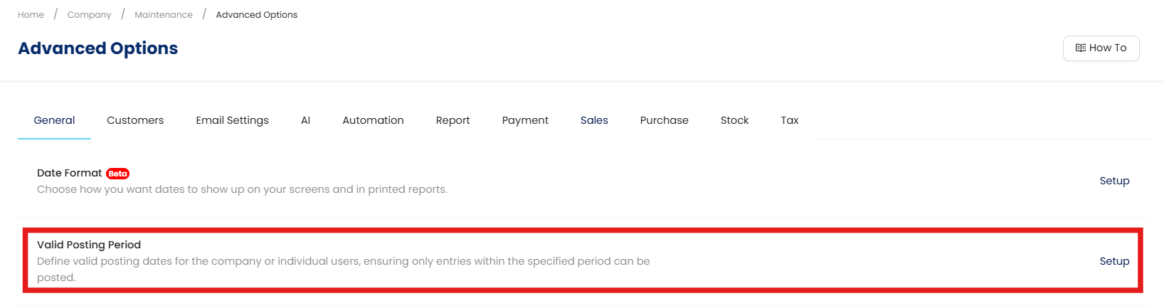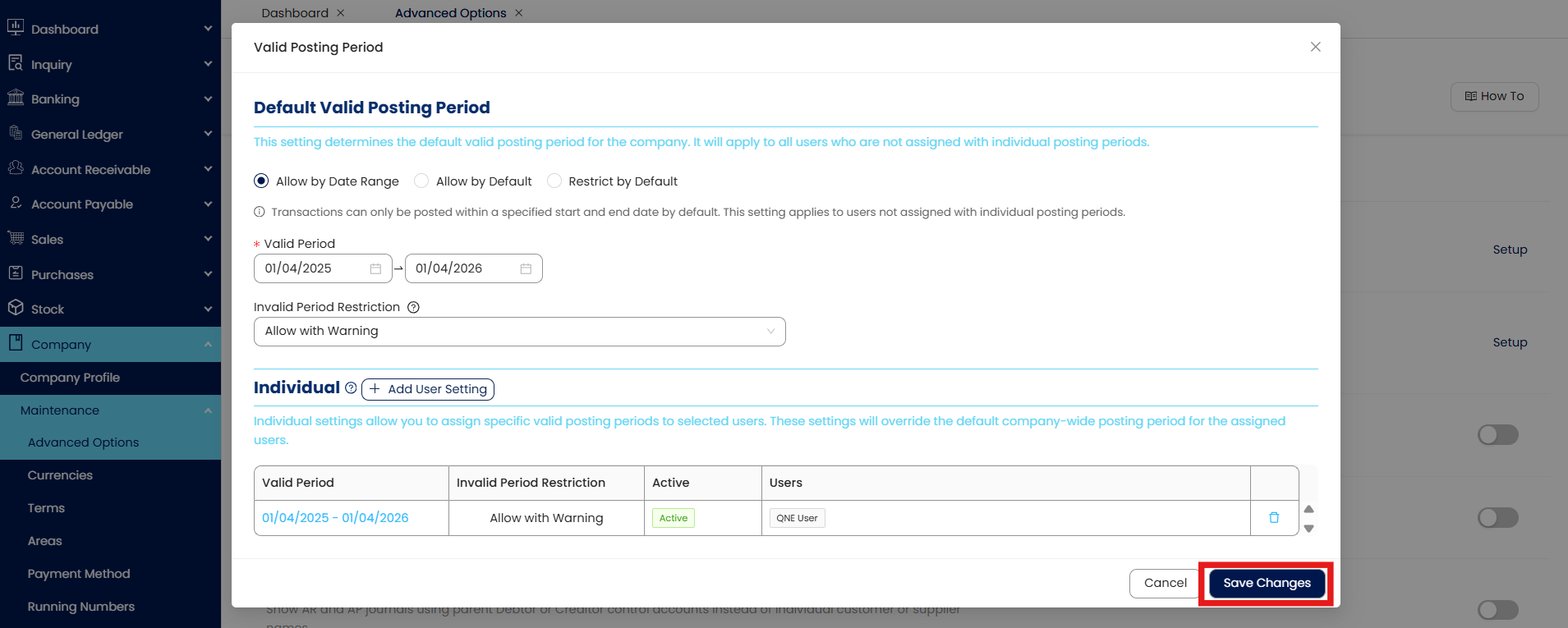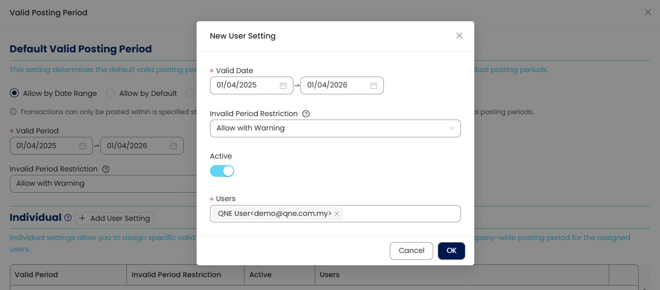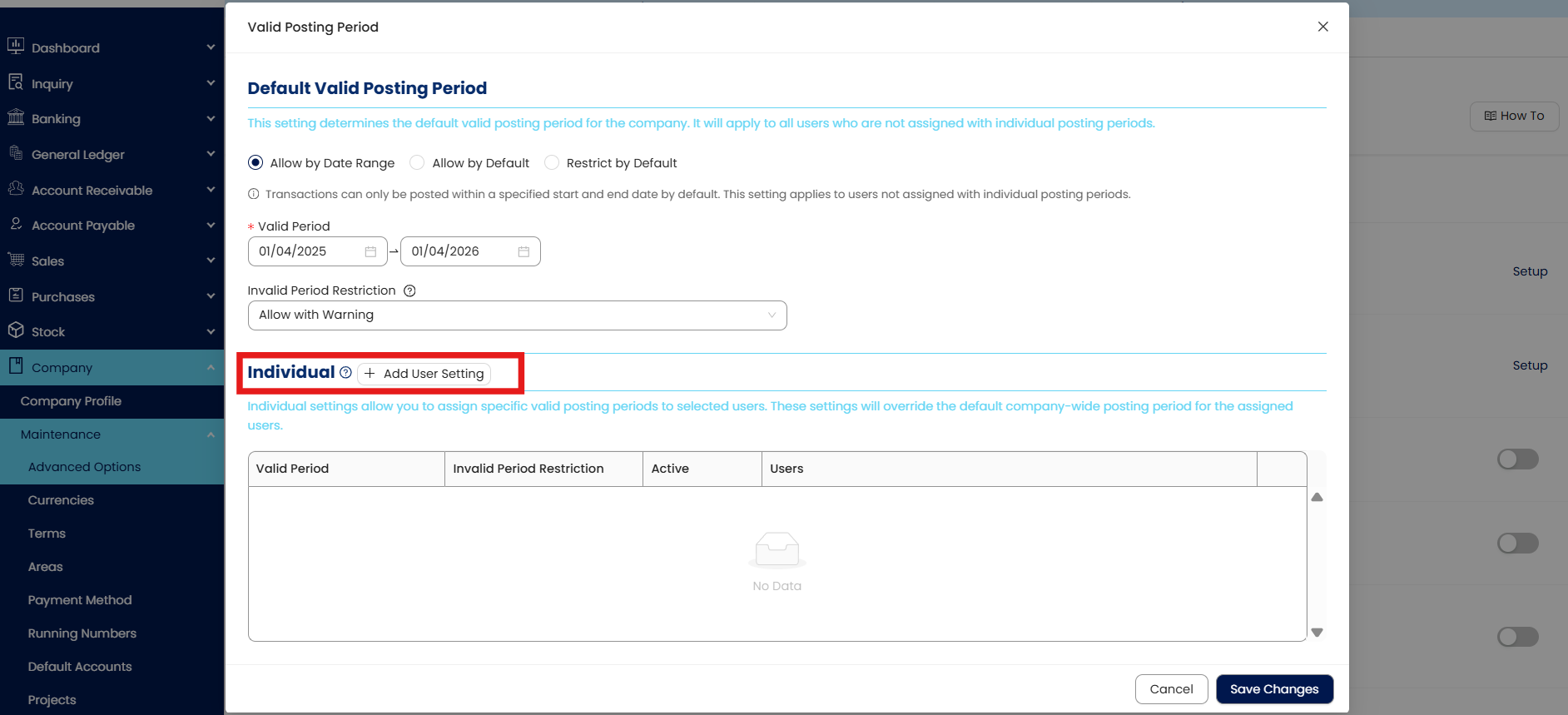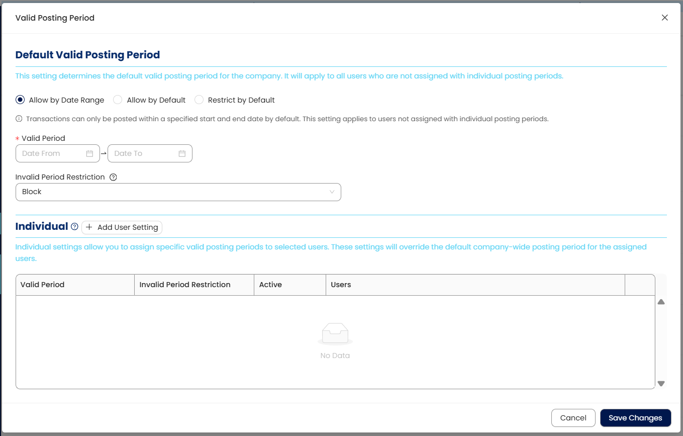 Valid Posting Period allows the user to control the posting of account entries based on the set valid dates in the System. By using the Valid Posting Period, it may limit the encoding of Backlog Transactions or Advance Postings. This function can be setup for all users or for specific user only.