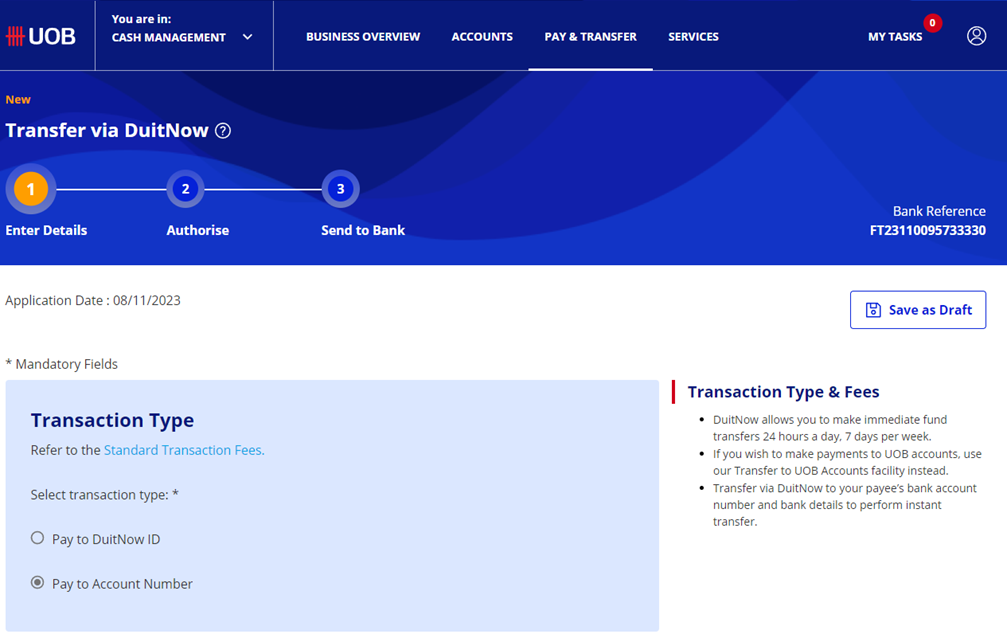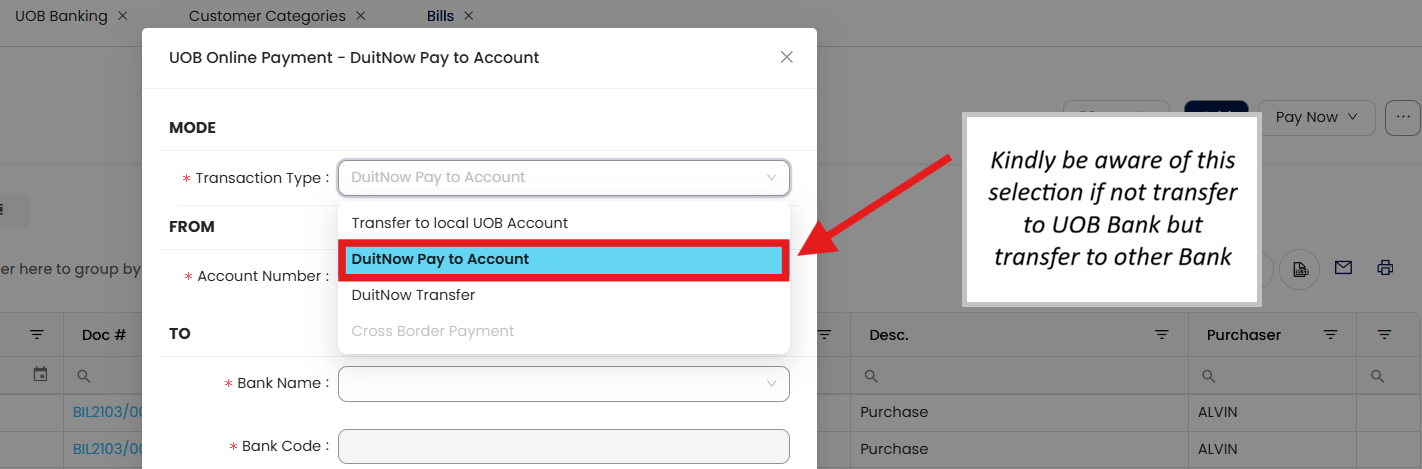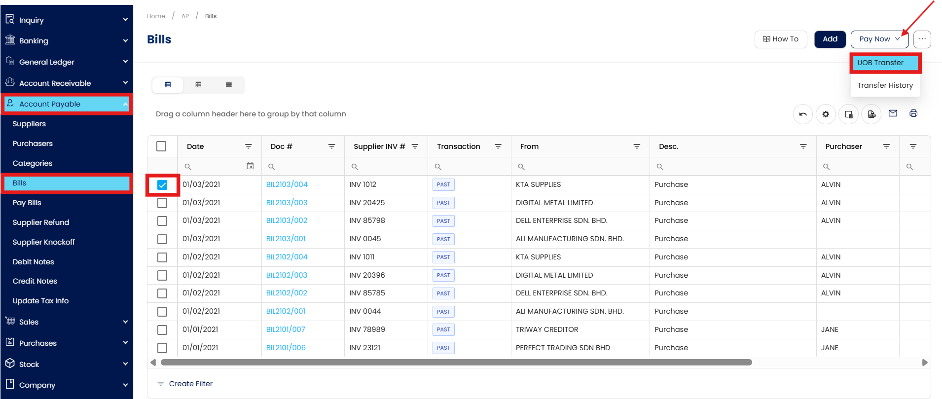 1) Go to Account Payable > Bills > Tick which transaction that need to be pay > Pay Now > UOB transfer