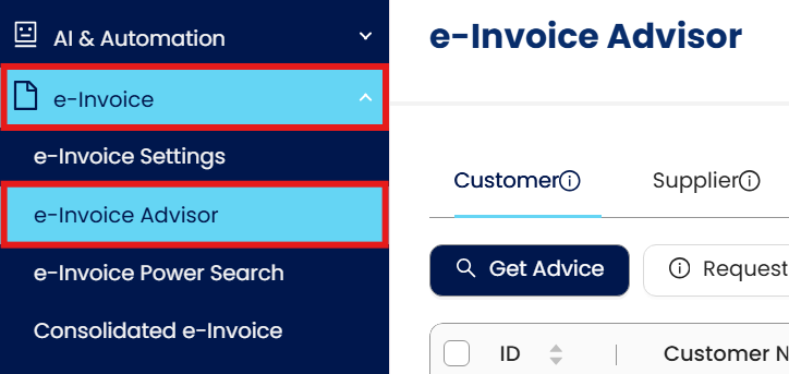 Go to Navigation > e-Invoice and click ‘e-Invoice Advisor’.