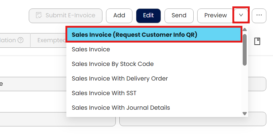 Once created, click the ‘Preview’ button and choose ‘Sales Invoice (Request Customer Info QR)’ format.
