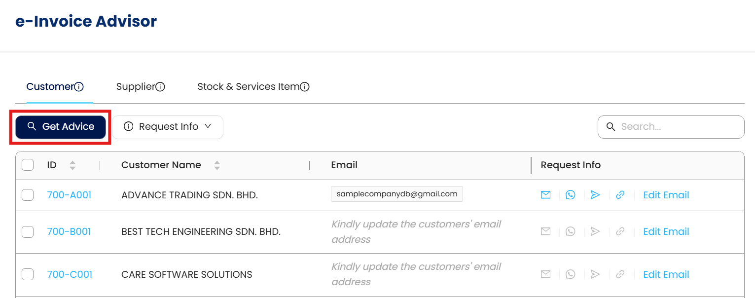 Click the ‘Get Advice’ button. It shows the list of customers who need to verify their tax information.