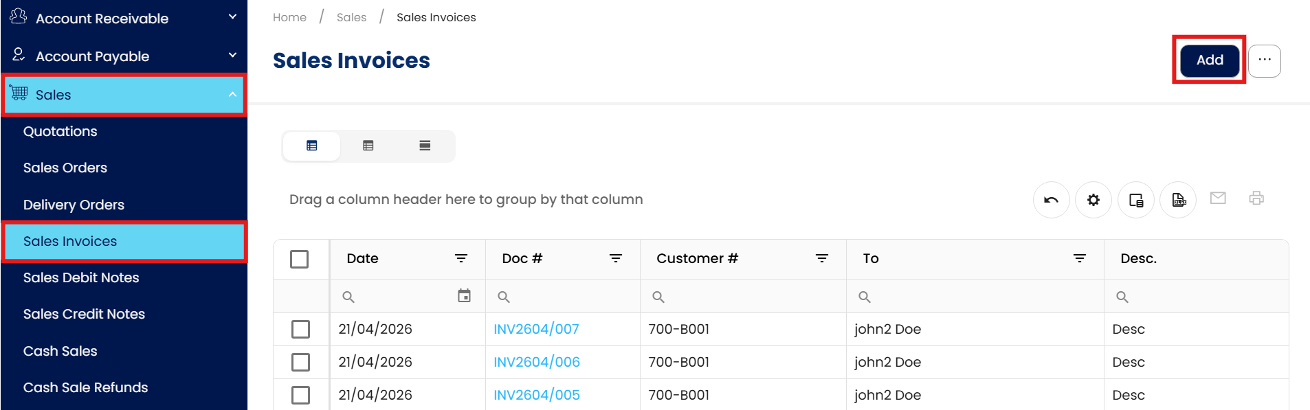 Go to Navigation > Sales and click Sales Invoices. Click ‘Add’ to create a Sales Invoice.