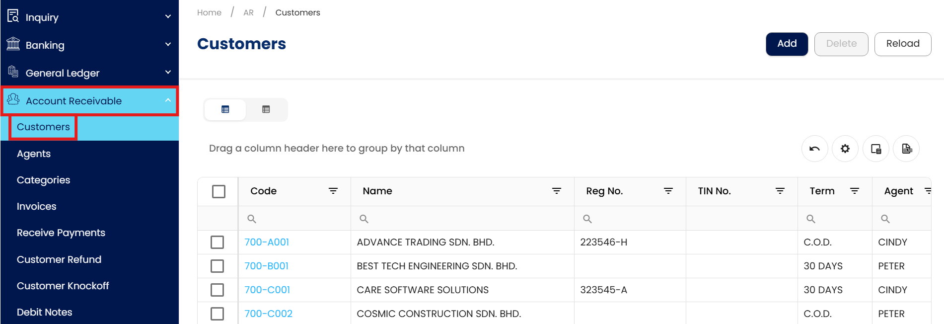 Go to Navigation > Accounts Receivable and click ‘Customers’.