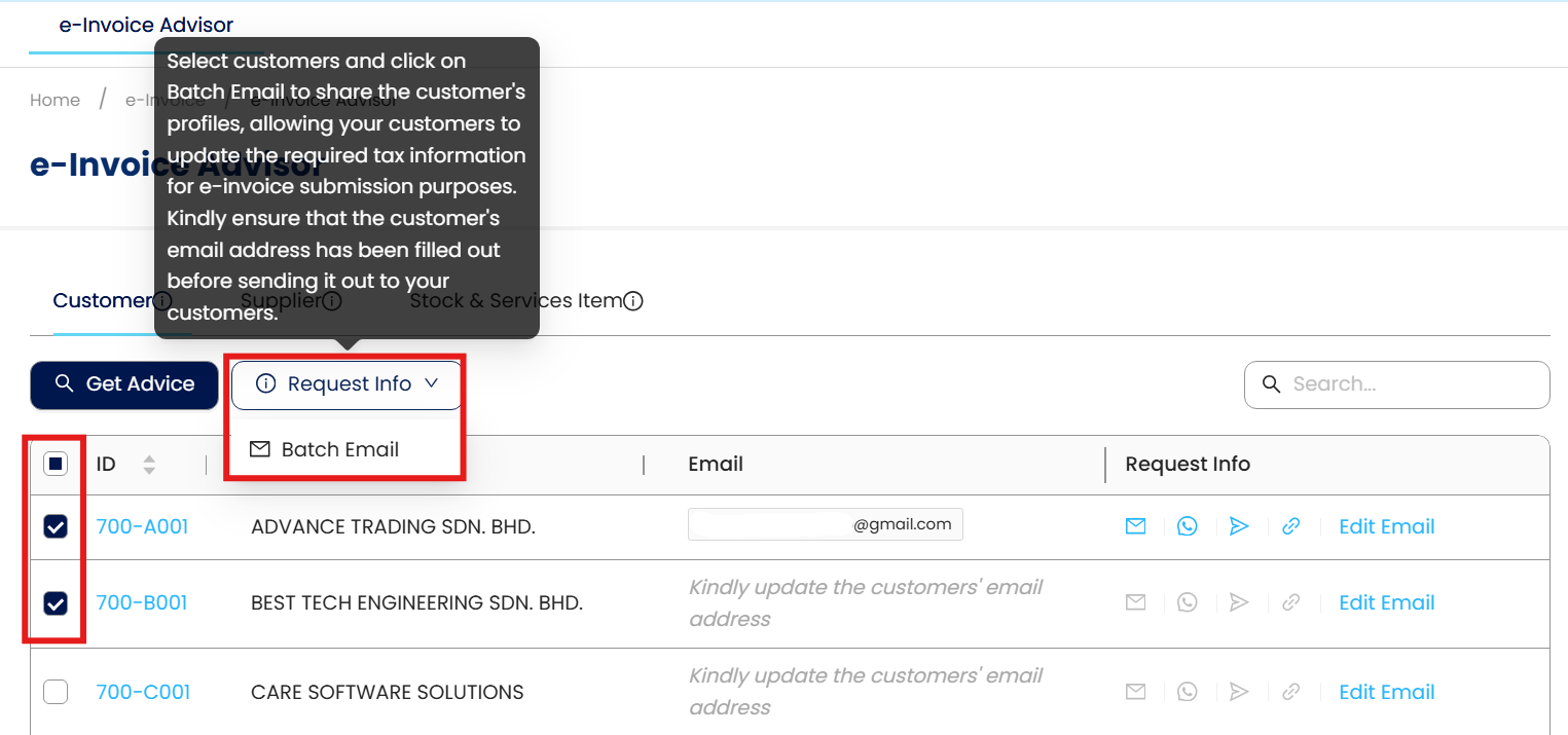 For Batch, use the checkbox to select Customers. Click the ‘Request Info’ button and choose ‘Batch Email’. Customers without email addresses cannot be selected, user may update the customers’ email address from this screen as well.