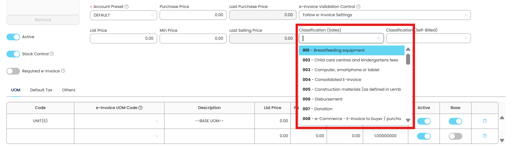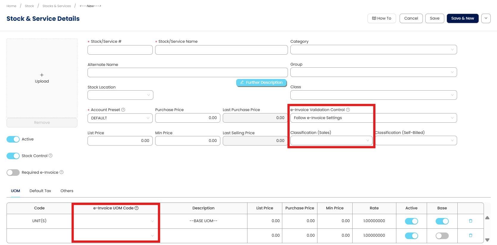 Completing the details for Stocks/Service items for the e-Invoice requirements.