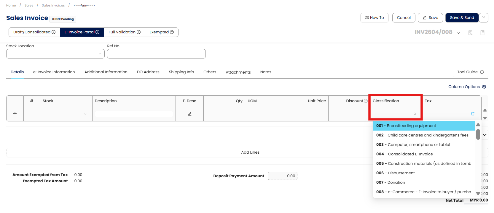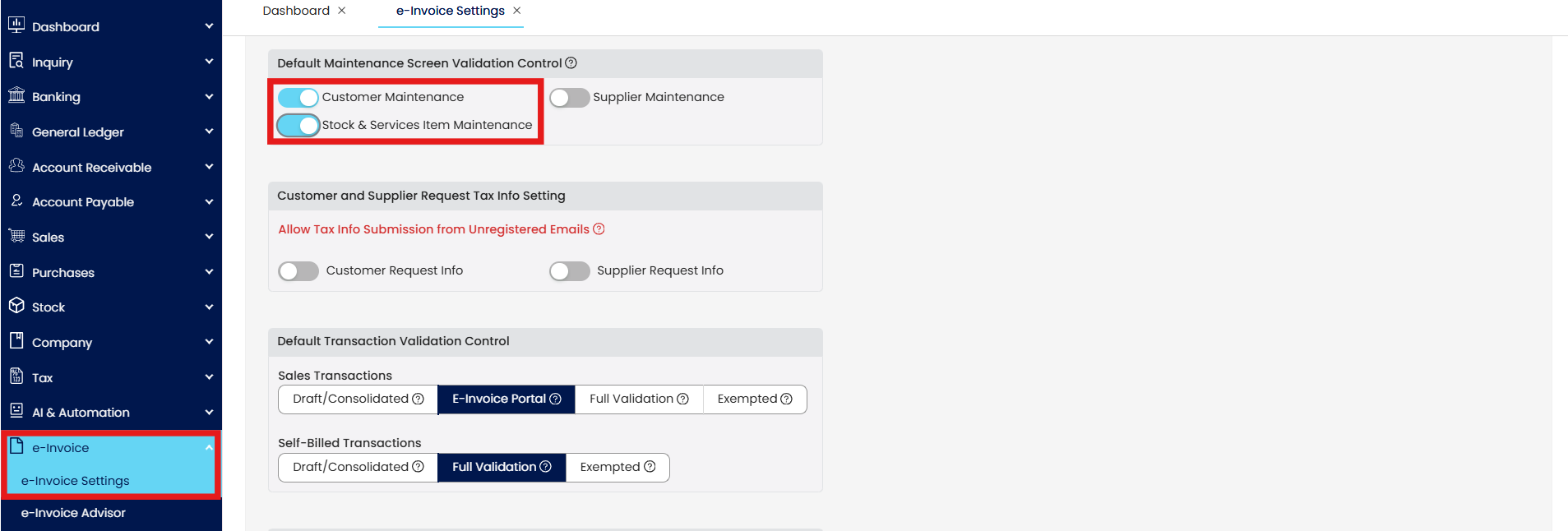 4. There will be a portion for the ‘e-Invoice Validation Control’ and e-invoice fields.