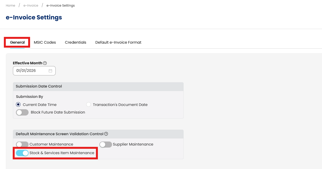 2. Under the General tab, go to the e-Invoice Required Fields Control Modules portion. Tick the option ‘Stock & Services Item Maintenance’.