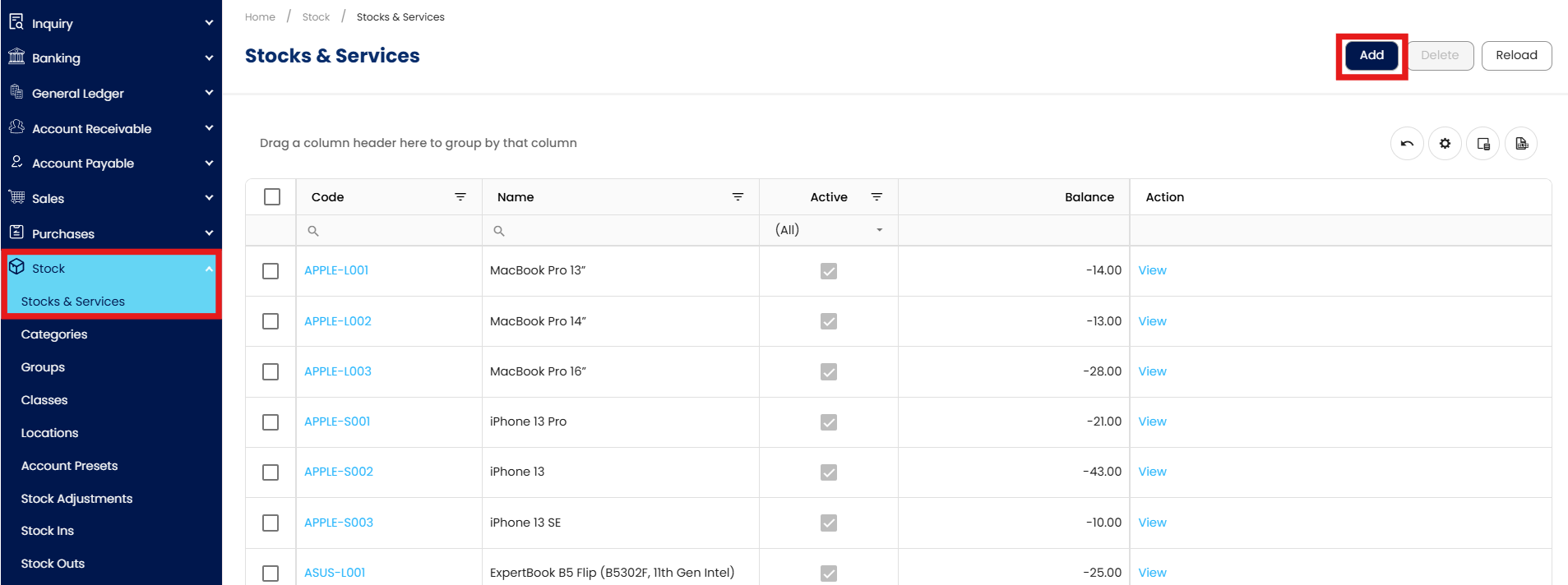 3. Go to Navigation > Stock and click Stocks & Services. Click the ‘Add’ button to create new stocks or service items.