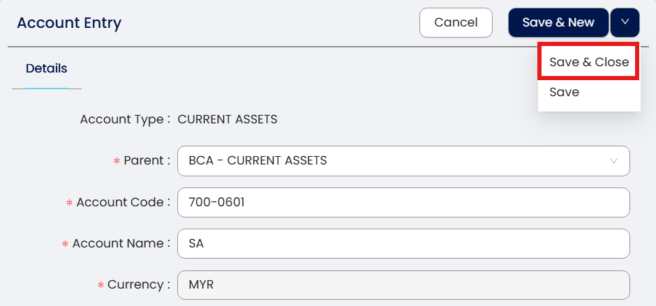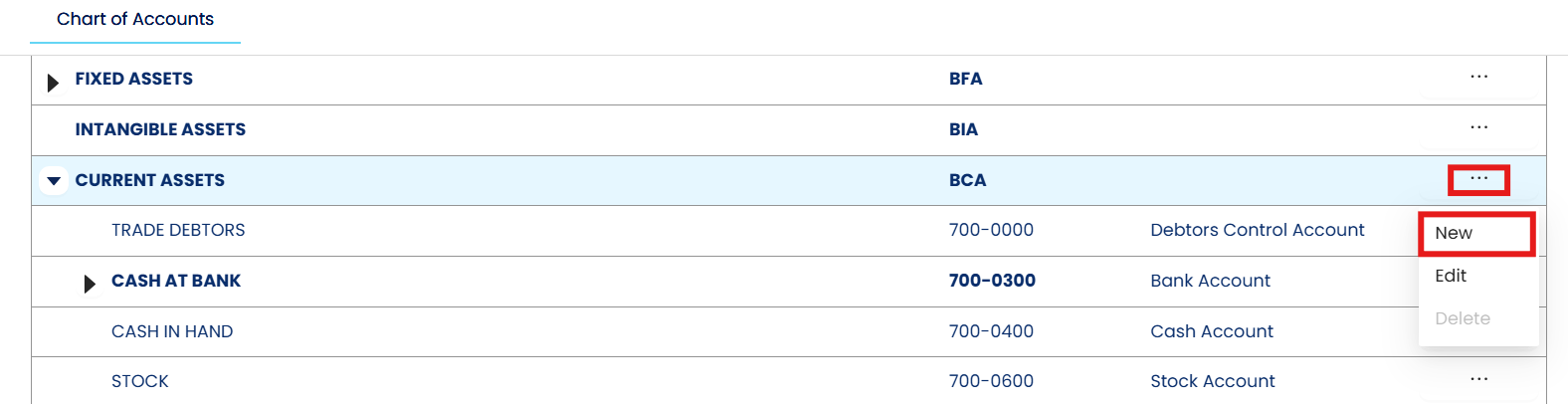 Press 3 dot Button which next to Current Assets > then Press 'New'.