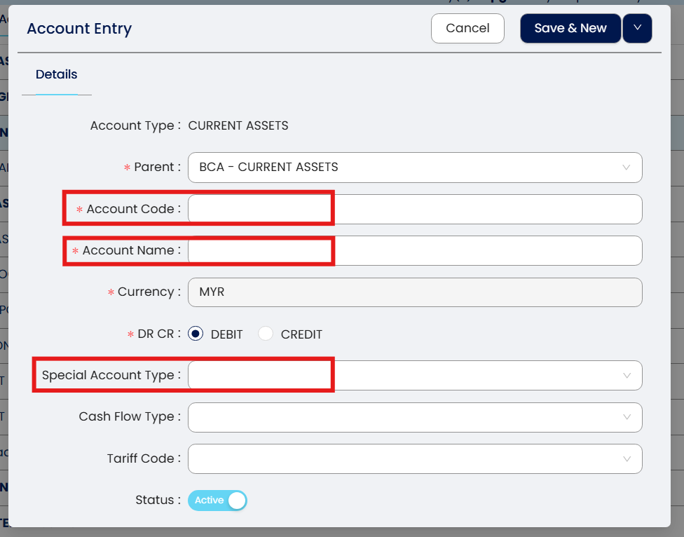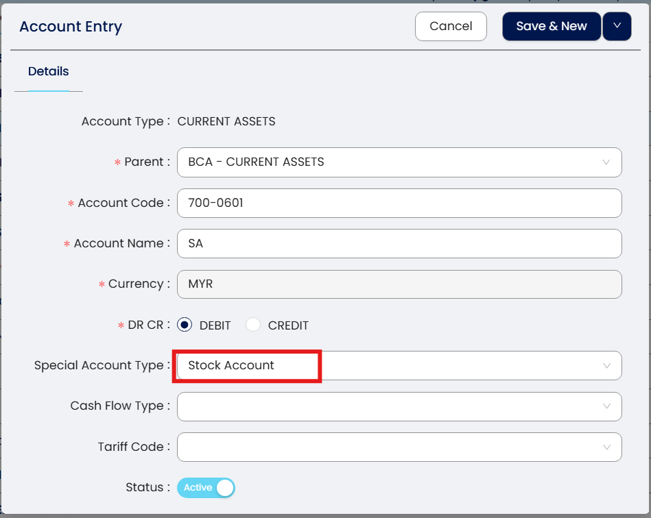 Note: Special Account type please select Stock Account.