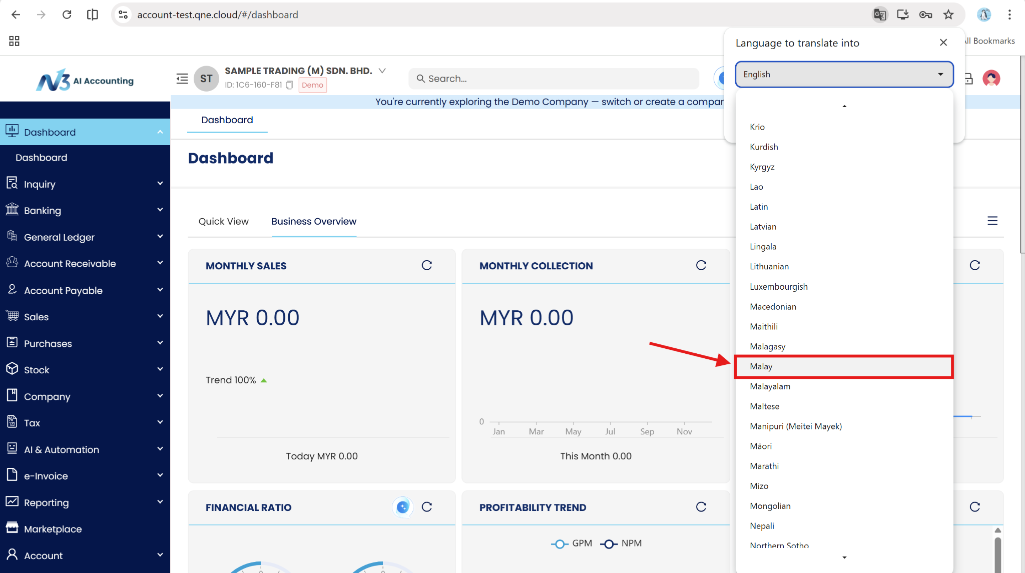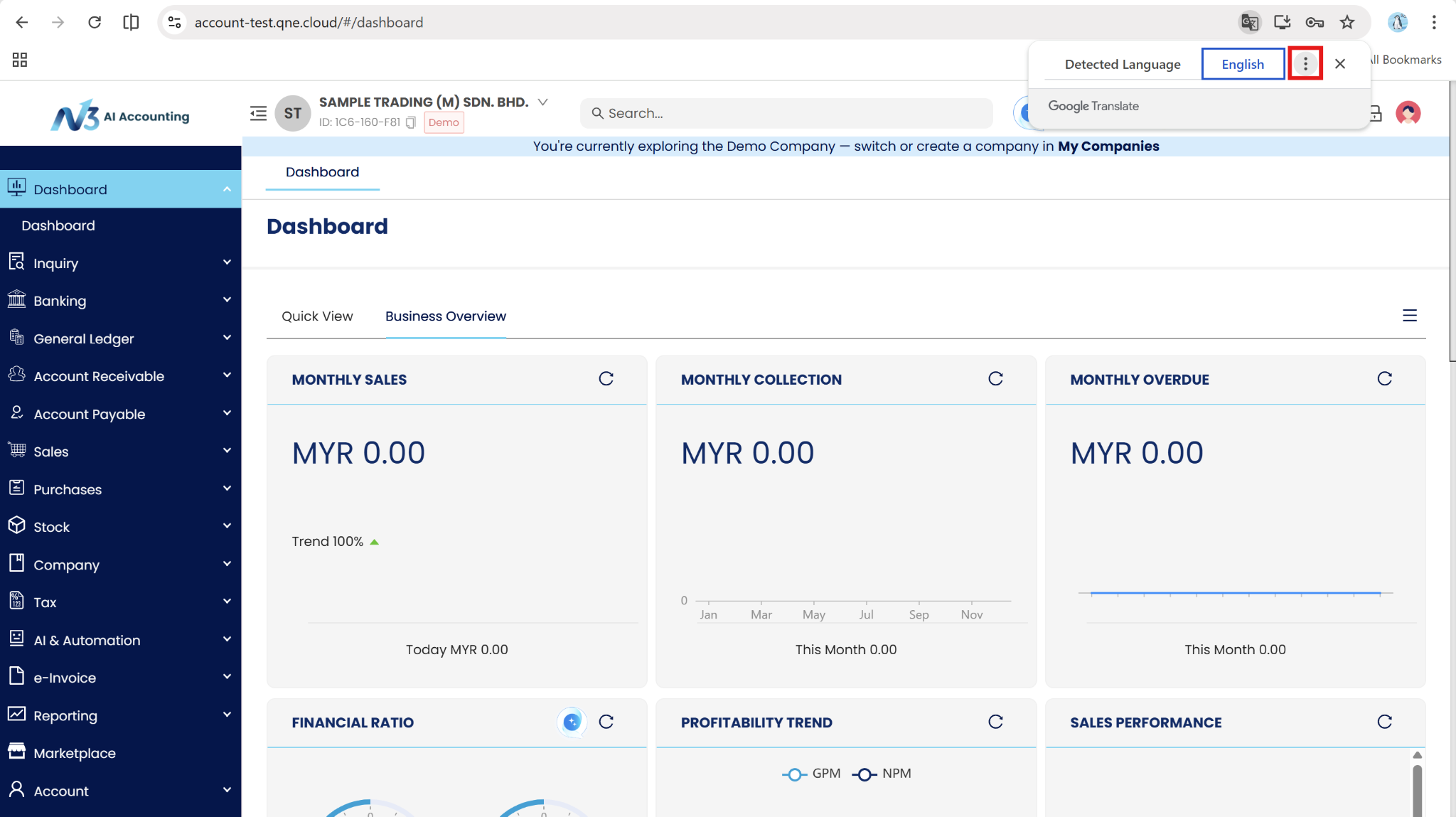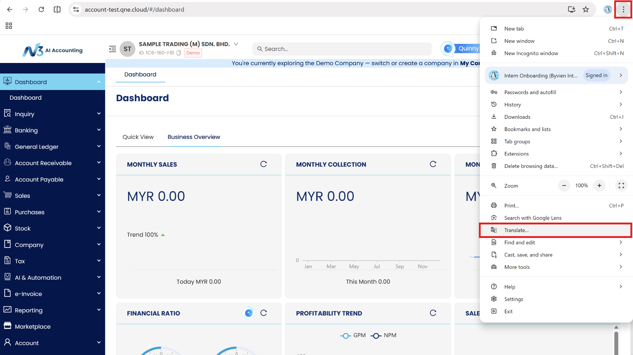 This guide is designed to help users leverage the Google Chrome browser's language translation feature to change the language settings in N3 AI Accounting. Given Malaysia's diverse population and various language preferences, it's essential to ensure that all users can access the platform in their preferred language. This guide will provide step-by-step instructions to make the translation process seamless and user-friendly.