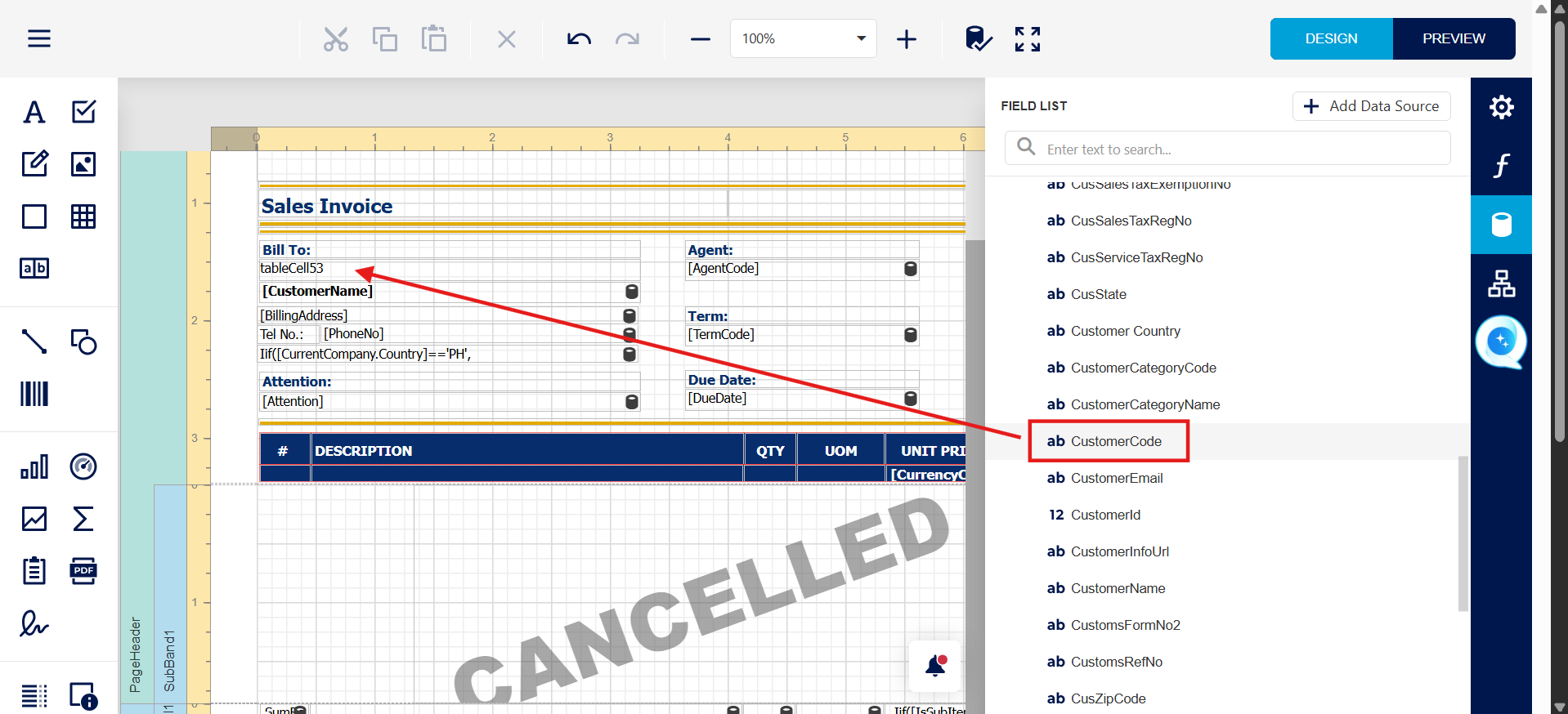 Step 6 - Scroll down the field list > then look for 'CustomerCode' field, drag it to TableCell53