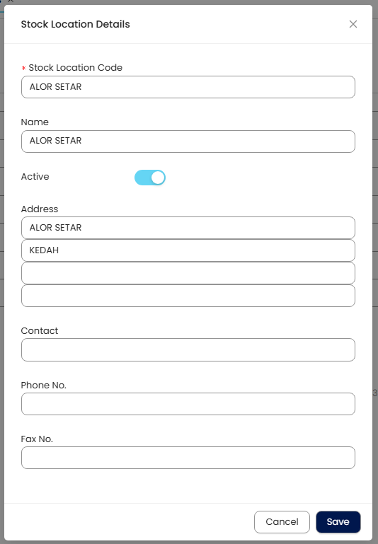 Stock Location Maintenance allows the user to maintain multiple warehouses for stock items, enabling the monitoring of the total quantity per item using supported reports for each stock location. In the system, Stock Location can be tagged in the header and can be set per stock item.