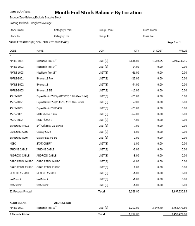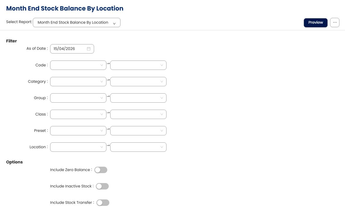 The Month End Stock Balance by Location Report enables users to generate an inventory report to show the remaining balance with values grouped by location.