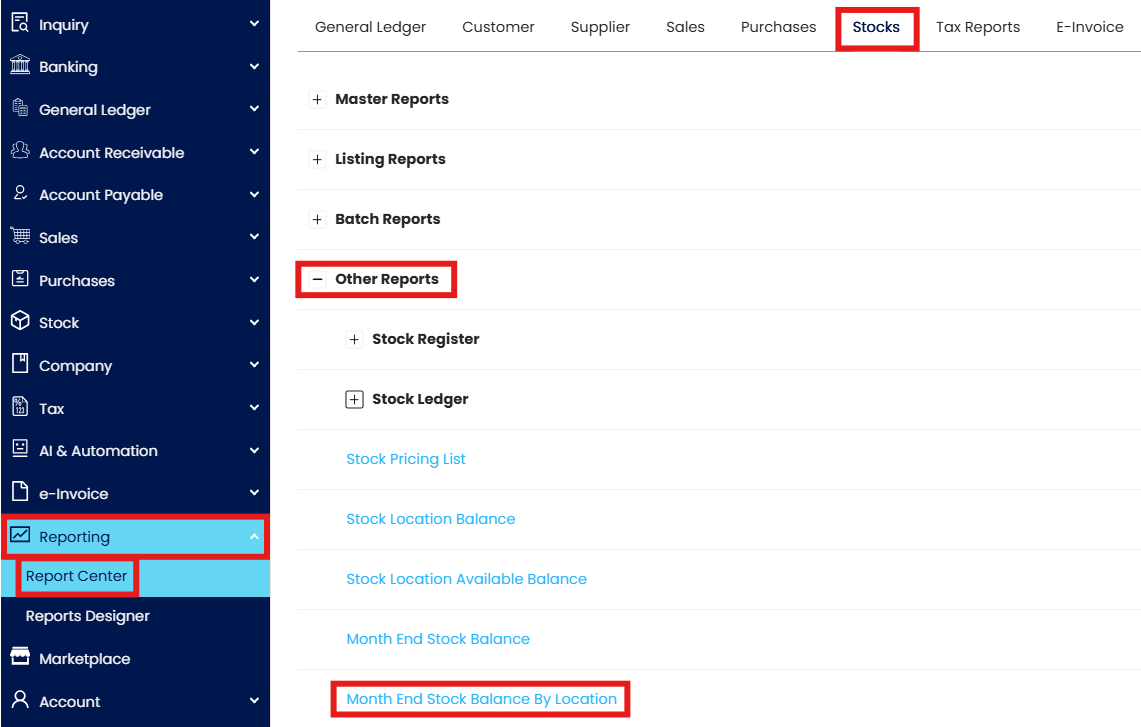 On the Navigation Pane, go to Reporting > Report Center. Under the Stocks tab, click Other Reports > Month End Stock Balance By Location.