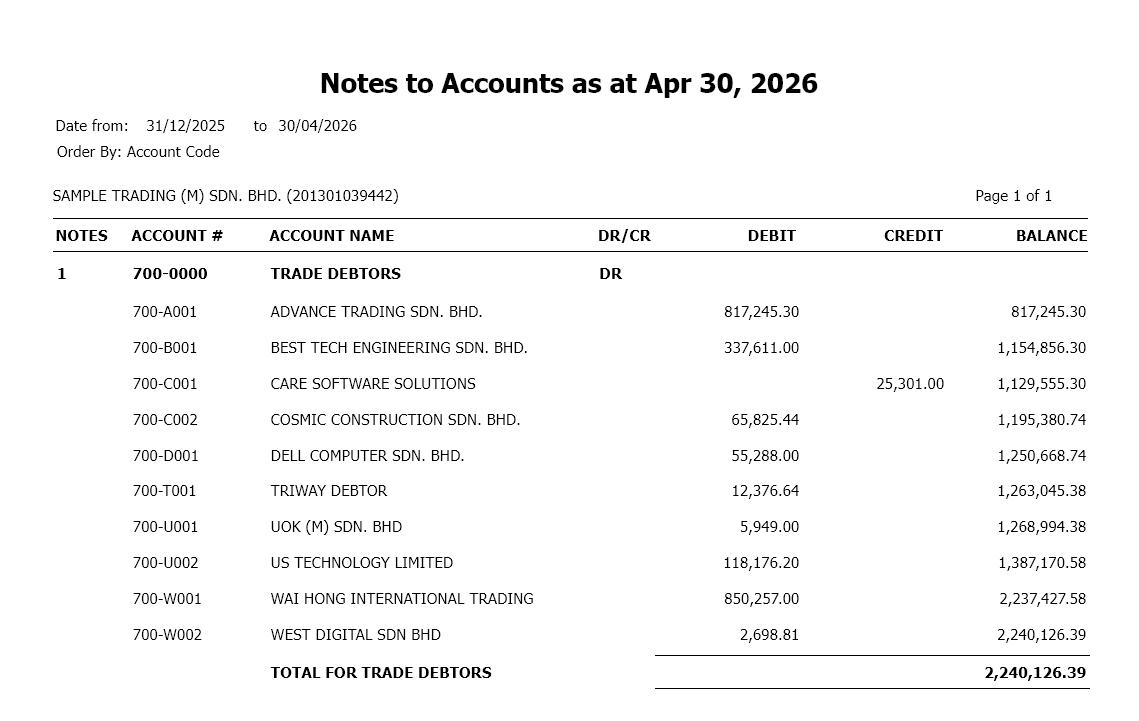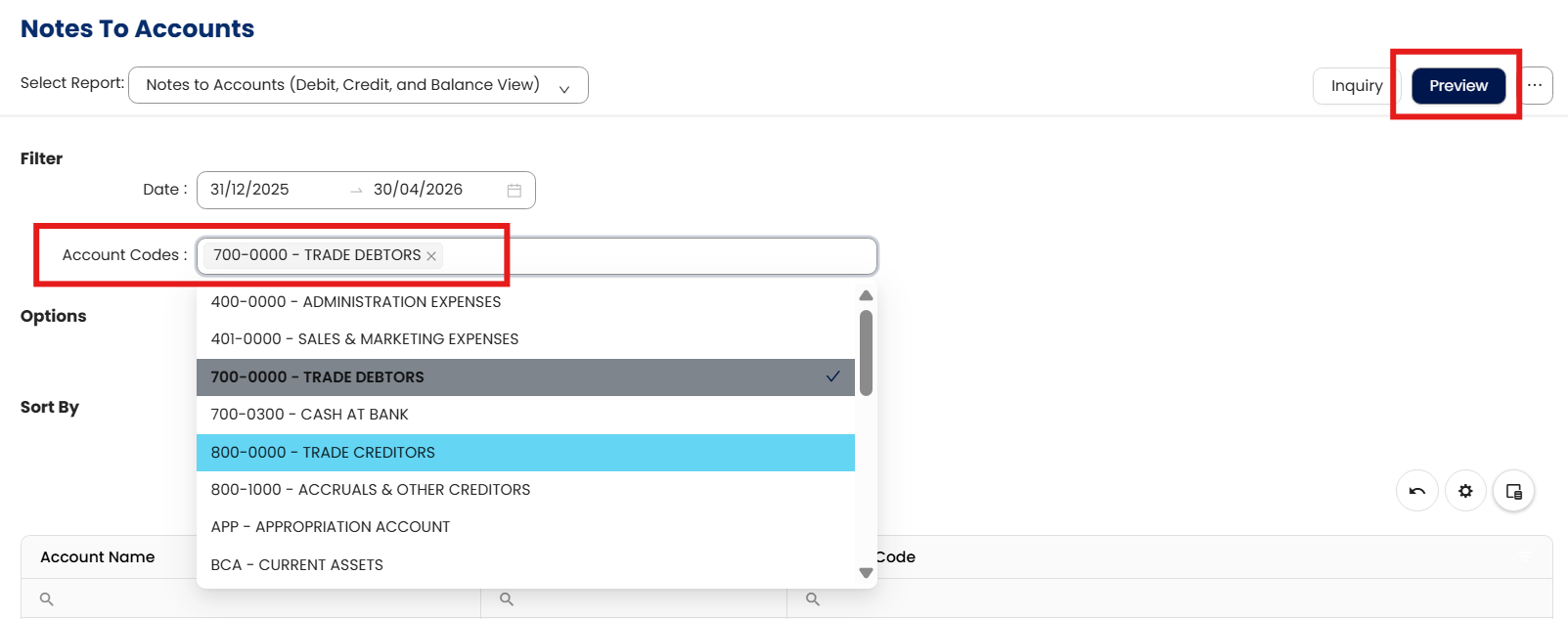 After Access into Note to Account report, user can filter Trade Debtors for Customer Balance Summary, or Filter Trade Creditors for Creditor Balance Summary > then Press Preview.