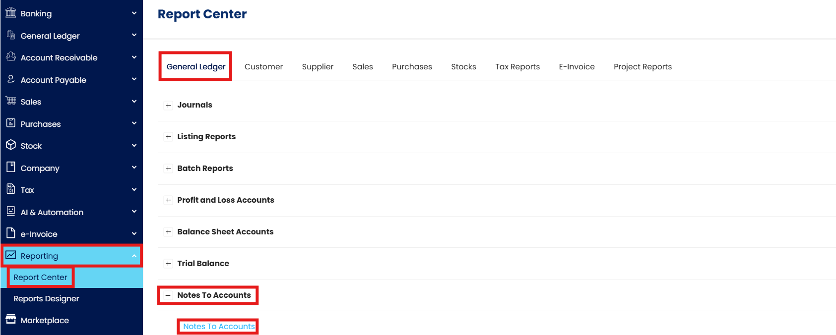 Expand Reporting > Press Report Center > In General Ledger Tab, Expand Note to Account > then Press Note To Accounts.