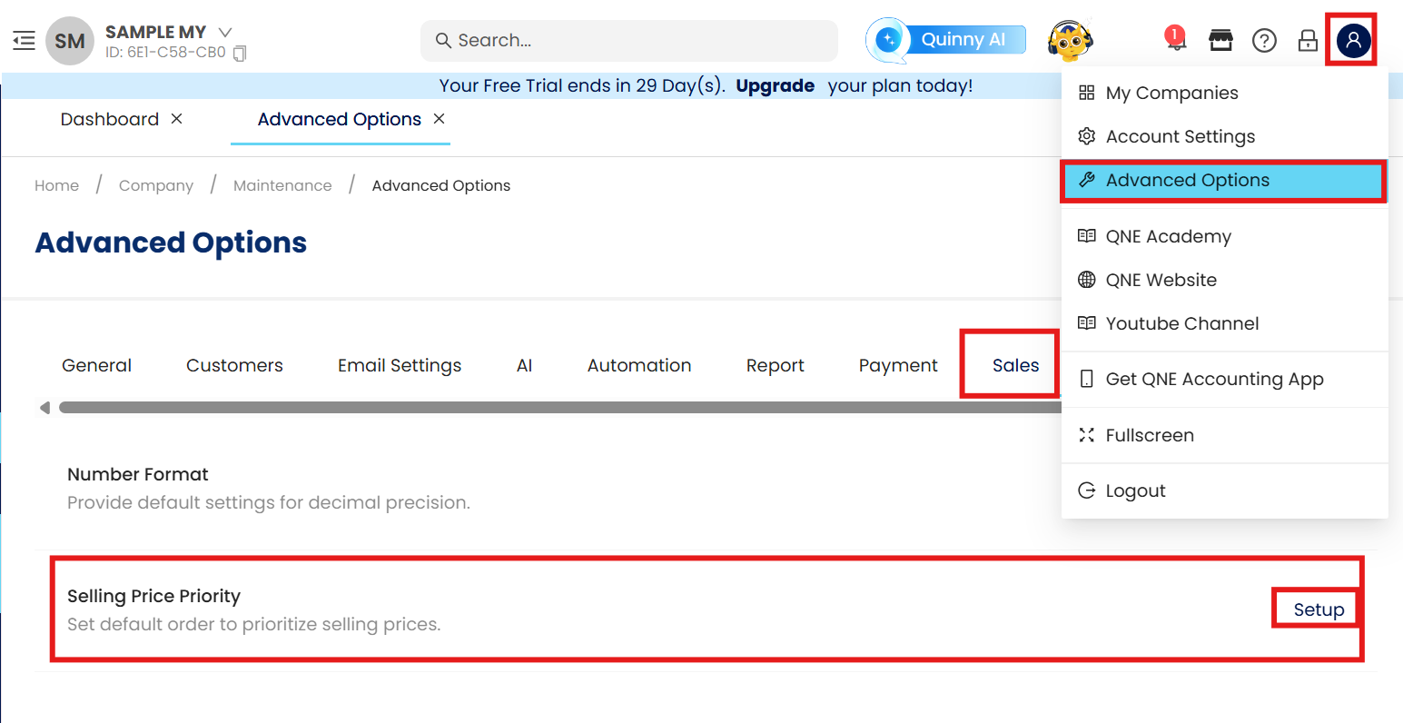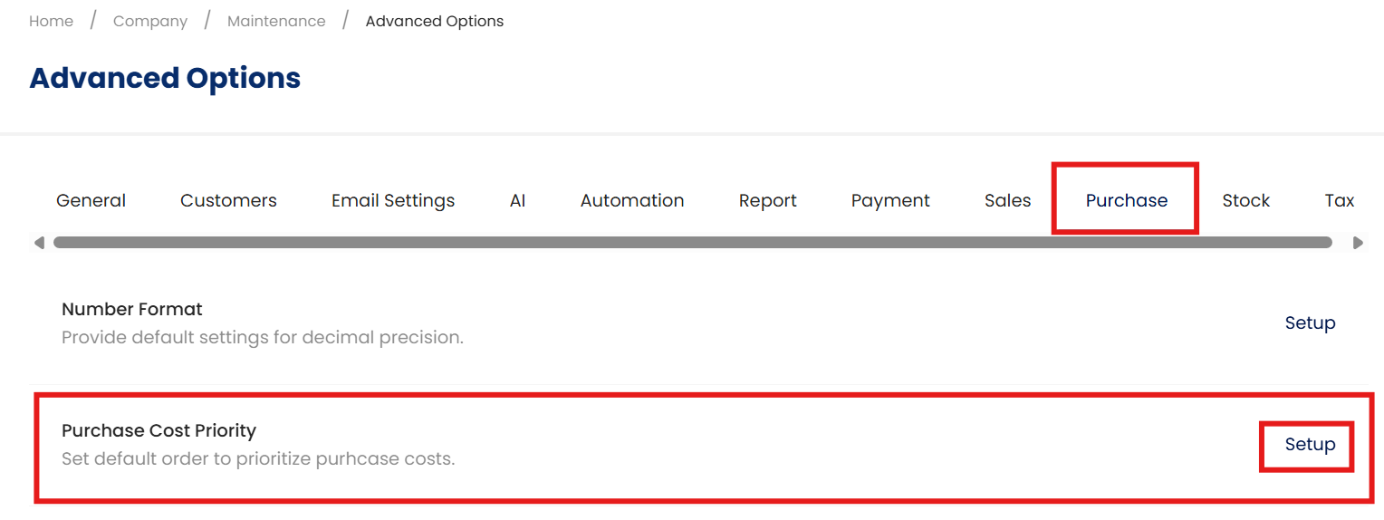 Go to 'Company Name' > Click Advanced Options > Navigate to the Sales Tab or Purchase Tab.